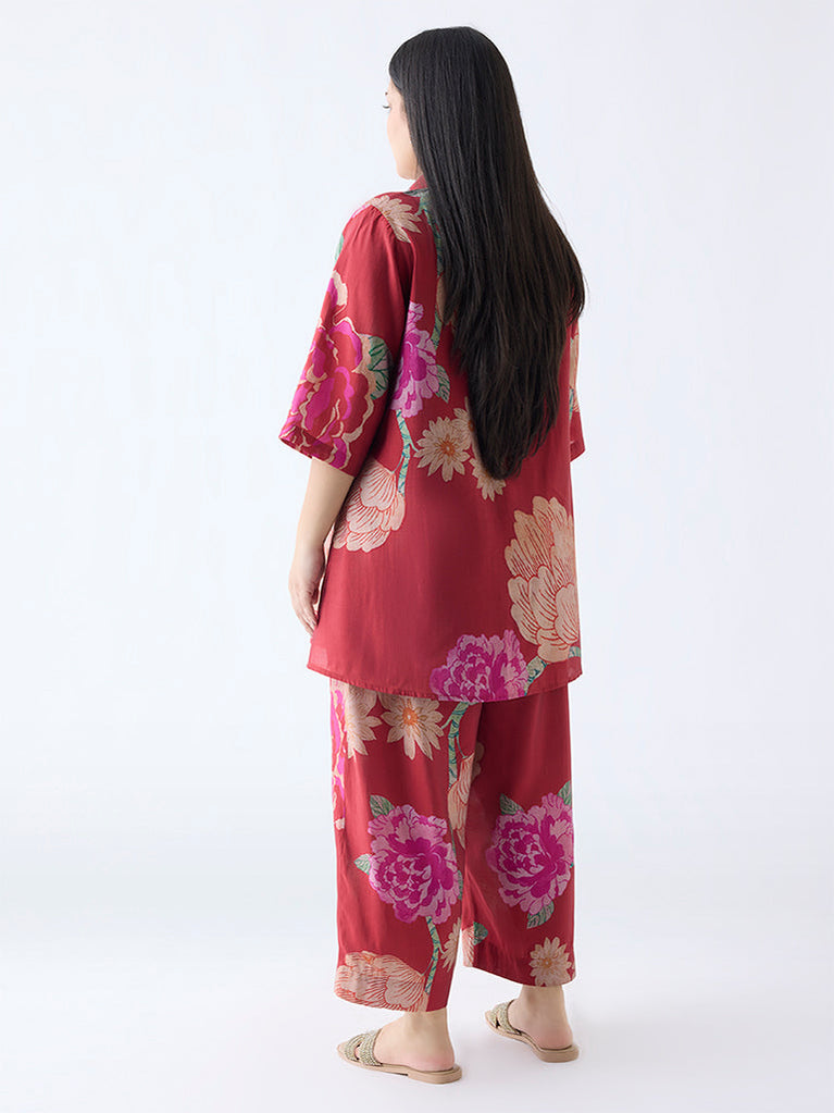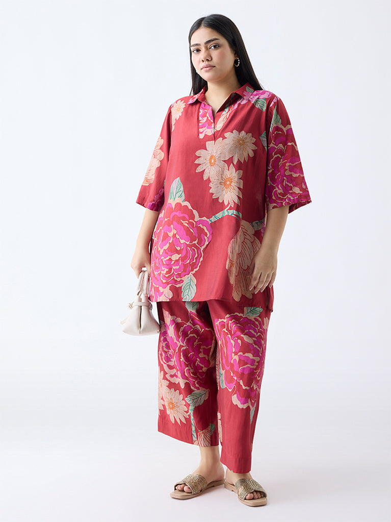 This red tunic from Diza is perfect for both casual and festive occasions. Designed with a flattering high-low silhouette in a smart shirt style, it boasts bold floral patterns for a touch of elegance. Pair with matching palazzos (sold separately) for a polished look.