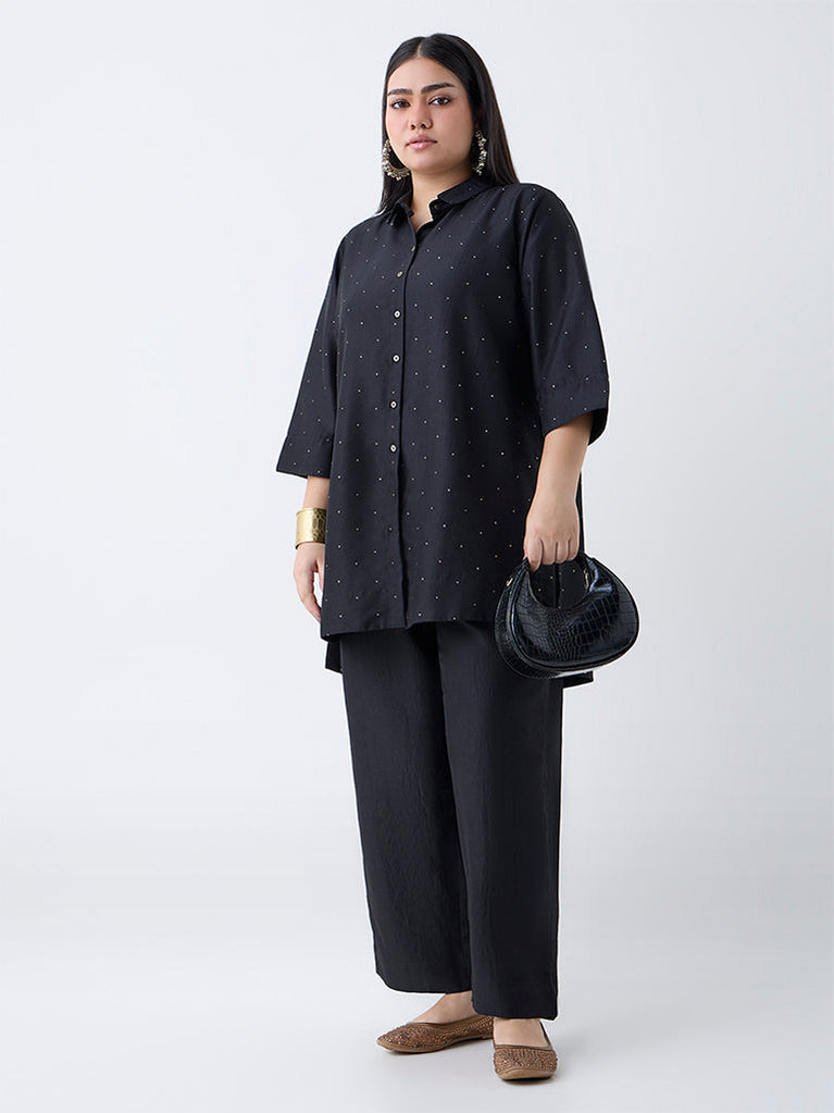Amplify your festive wardrobe with this black ethnic tunic from Diza, adorned with delicate embellishments that add a subtle shimmer. Designed with a collar and button placket, it is finished with three-fourth sleeves for an elegant yet versatile look.