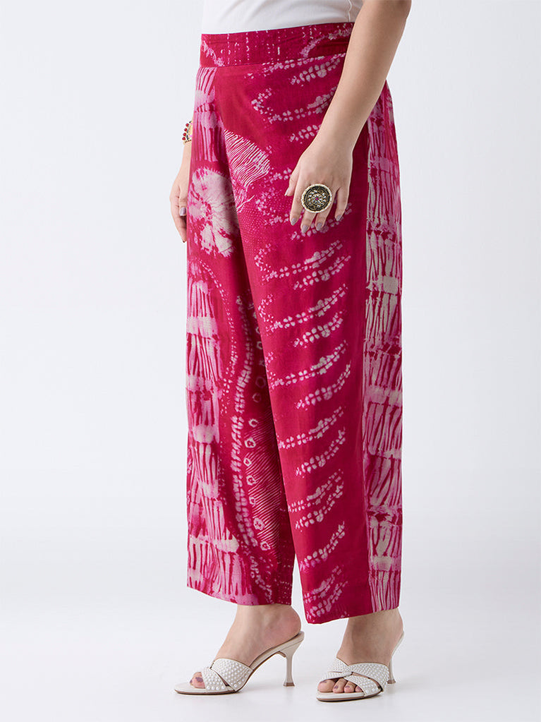 Add a vibrant twist to your festive ensembles with these magenta ethnic pants by Diza, showcasing striking abstract prints. Designed with an elasticated waistband for comfort and side pockets for function, the lively design makes a playful base for both solid and embroidered kurtas.