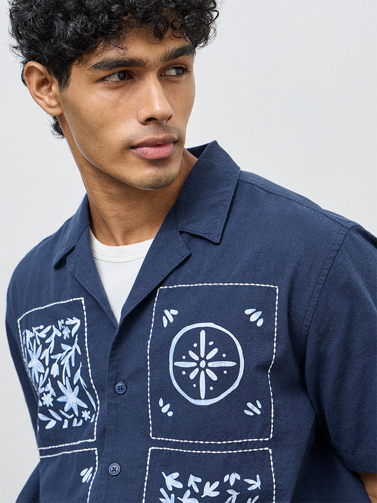 Channel easy summer dressing as ETA presents this navy shirt detailed with printed accents at the front. Crafted from pure cotton for breathable comfort, it features a camp collar, button placket, and short sleeves in a relaxed handle.