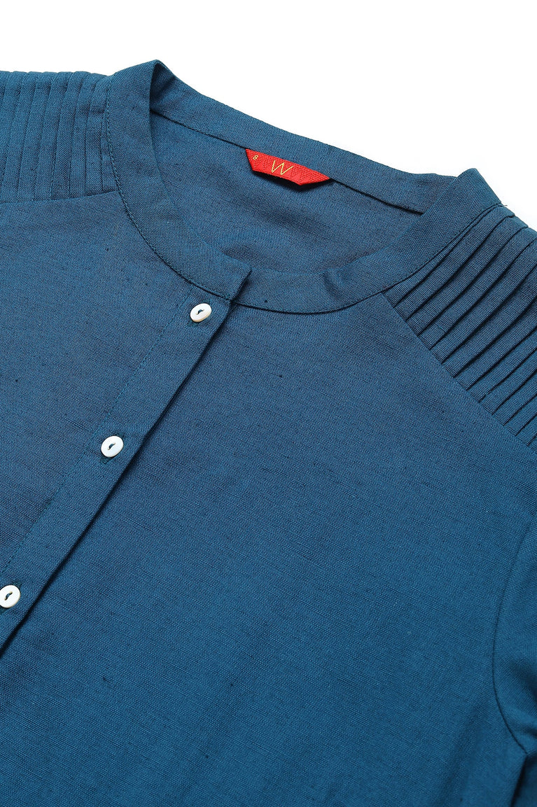 Ink Blue Half Placket kurta With Mandarin Collar And Pleat Detail On The Shoulders
