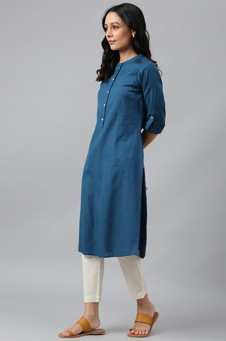 Blue Solid Snow Linen Straight Kurta With Thread Work On Neck