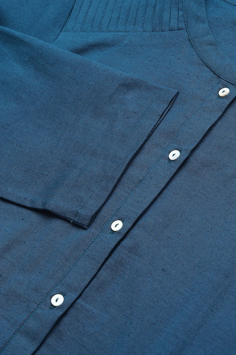Blue Solid Cotton Shirt Kurta in Mandarin Collar