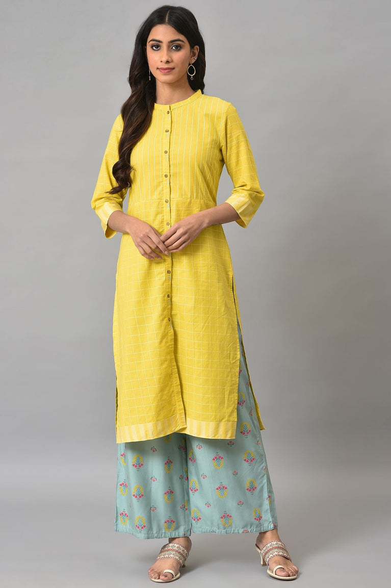Beige and yellow round neck 3/4 sleeve kurta has printed detail, front slit and high-low hemline.