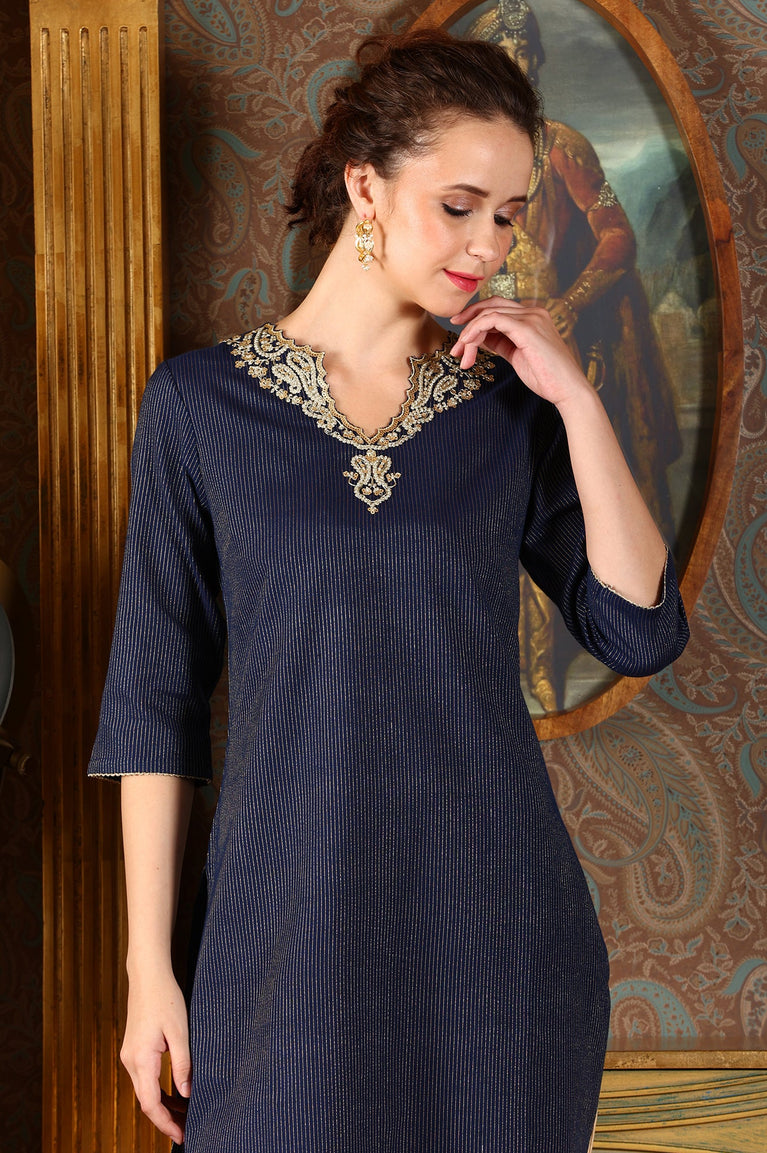 Navy Blue Textured Straight Kurta With Thread Embroidered Yoke