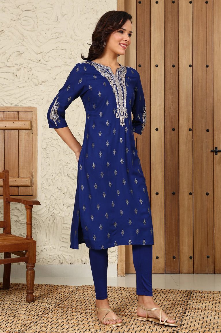 Discover effortless elegance with this blue viscose kurta. Tailored for the modern woman, this casual ethnic piece is perfect for various occasions. The woven construction ensures durability and comfort, while the 100% viscose fabric offers a luxurious feel against the skin. Featuring exquisite embroidery, this kurta adds a touch of sophistication to your wardrobe. The straight cut flatters all body types, and the three-quarter sleeves provide versatility for different seasons. The keyhole neckline adds a contemporary twist to this traditional garment. Whether paired with leggings or palazzo pants, this kurta is sure to make a statement. Embrace your cultural roots with this beautifully crafted piece that combines tradition with modern aesthetics.