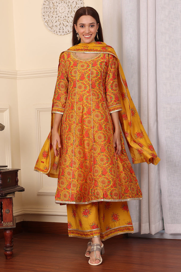 Mustard Yellow Floral Printed Chanderi Anarkali Kurta With Embroidery, Flared Pants And Dupatta Set