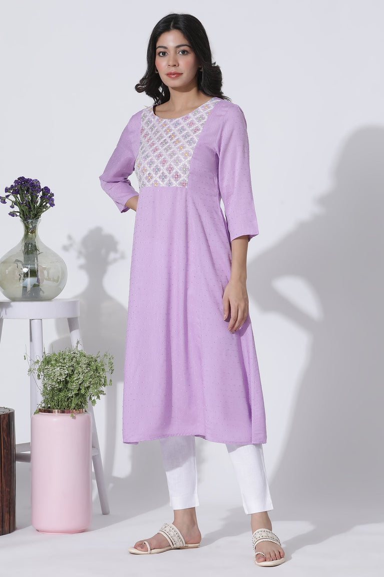 This textured fabric A-line kurta features a charming lilac shade with a subtle swiss dot pattern. Its A-line silhouette offers a graceful and flattering fit. The kurta is beautifully detailed with a thread mesh embroidered yoke, adding an elegant and intricate touch. This combination of textures and embroidery makes it a sophisticated choice for a variety of occasions.