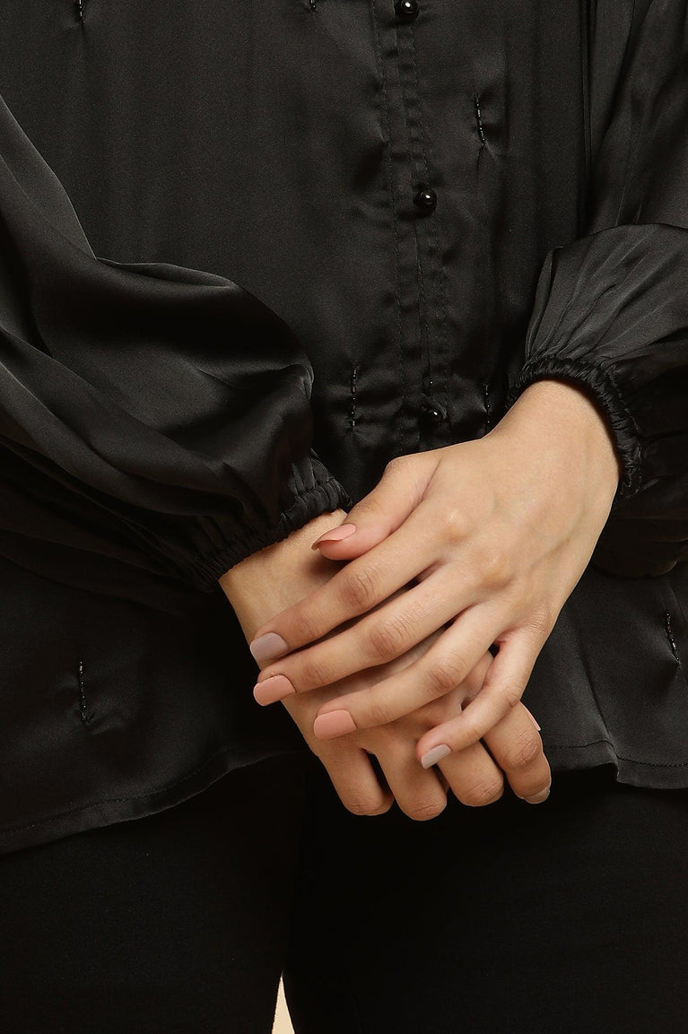 Elevate your wardrobe with this exquisite women's black top, perfect for fusion-inspired occasions. The band neckline adds a touch of sophistication, while the full sleeves provide elegant coverage. Crafted using a woven construction technique, this top exemplifies quality craftsmanship. The straight silhouette flatters various body types, making it a versatile addition to your closet. Embellished details add a glamorous touch, making it suitable for elevated events. The top is fashioned from 100% polyester, ensuring durability and easy maintenance. The satin finish gives it a luxurious sheen, enhancing its overall appeal. This fusion piece seamlessly blends traditional and contemporary styles, making it a must-have for the modern woman who appreciates cultural diversity in fashion. Whether paired with tailored pants for a formal look or styled with a skirt for a more casual ensemble, this top is sure to make a statement. Its versatility allows for numerous styling options, making it a valuable investment for your wardrobe. The black color adds a timeless elegance, ensuring that this piece remains a favorite for seasons to come.