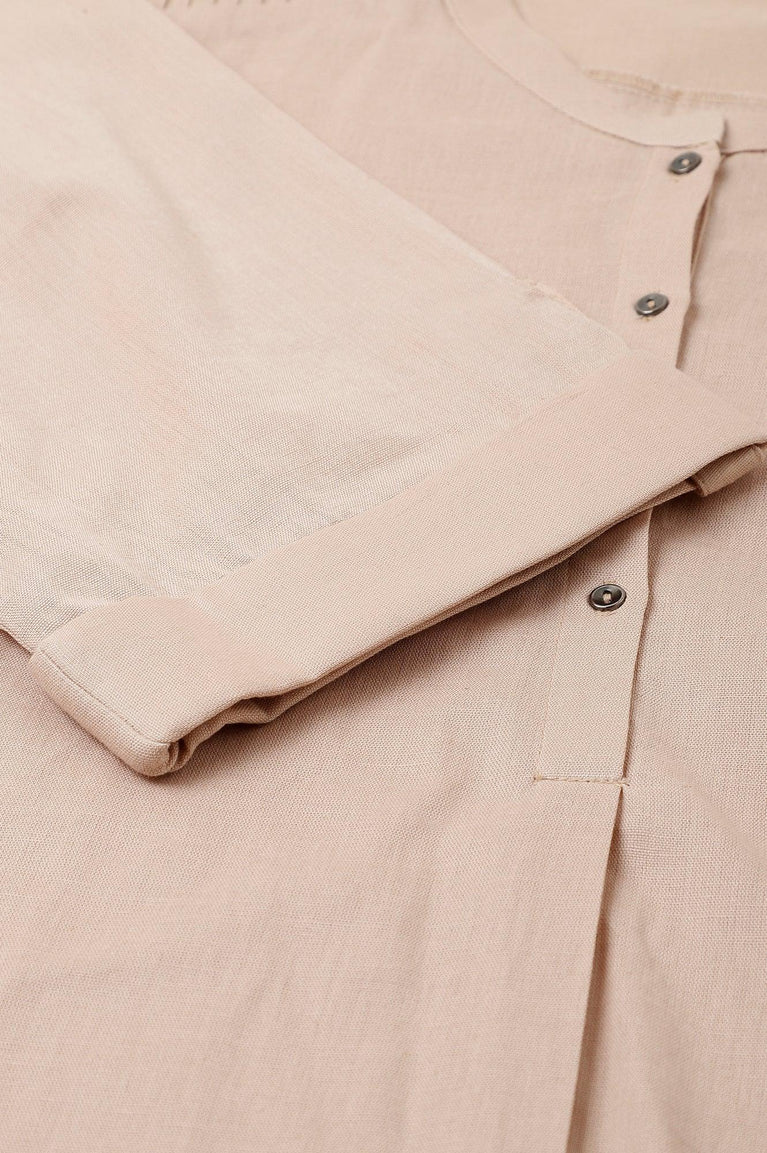 Beige Top With Mandarin Collar, Turn Up Sleeves With Tab And Pleat Detail On Shoulders