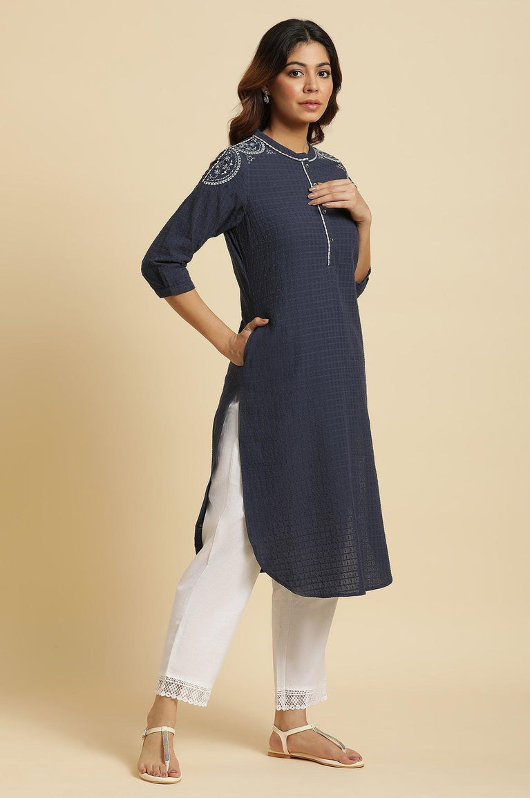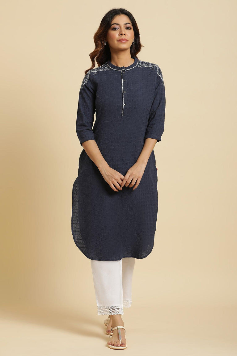 Midnight Blue Straight Kurta With A Curved Hemline Crafted In Textured Cotton Dobby. It Has A Mandarin Collar And Chunky Contrast Thread Embroidery On The Shoulders. The Kurta Also Features Side Pockets.