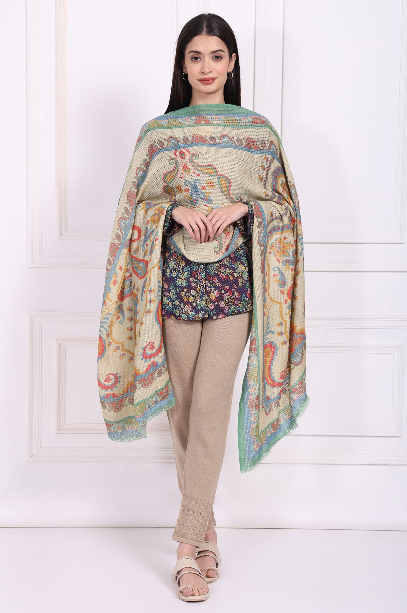 A whisper of heritage for the modern muse, this piece is more than just an accessory; it's a wearable story. This exquisite stole for women is a masterpiece of woven artistry, designed to be the crowning glory of your winter wardrobe. Crafted from a sumptuously soft and warm wool blend, its generous expanse—measuring 2 meters in length and 70 centimeters in width—offers versatile draping possibilities, feeling substantial yet wonderfully fluid against the skin. The completely opaque fabric showcases a breathtaking, all-over paisley pattern, a classic design reimagined in a sophisticated palette for today's discerning woman. A base of tranquil Ecru Sand provides the perfect canvas for intricate ethnic motifs that dance in vibrant shades of rich Teal, warm Mandarin, and deep Cerulean blue. This designer stole is a perfect example of a timeless ethnic shawl, making it an essential addition to your collection. It is ideal for elevating everything from a simple kurta to a contemporary dress. The intricate woven design is meticulously finished with short, delicate fringes along the ends, adding a touch of classic texture and graceful movement. Whether you're attending a festive celebration, a family gathering, or simply adding a layer of refined elegance to your daily ensemble, this woven winter wrap promises both comforting warmth and undeniable style. You’ll find yourself reaching for this versatile piece time and again.