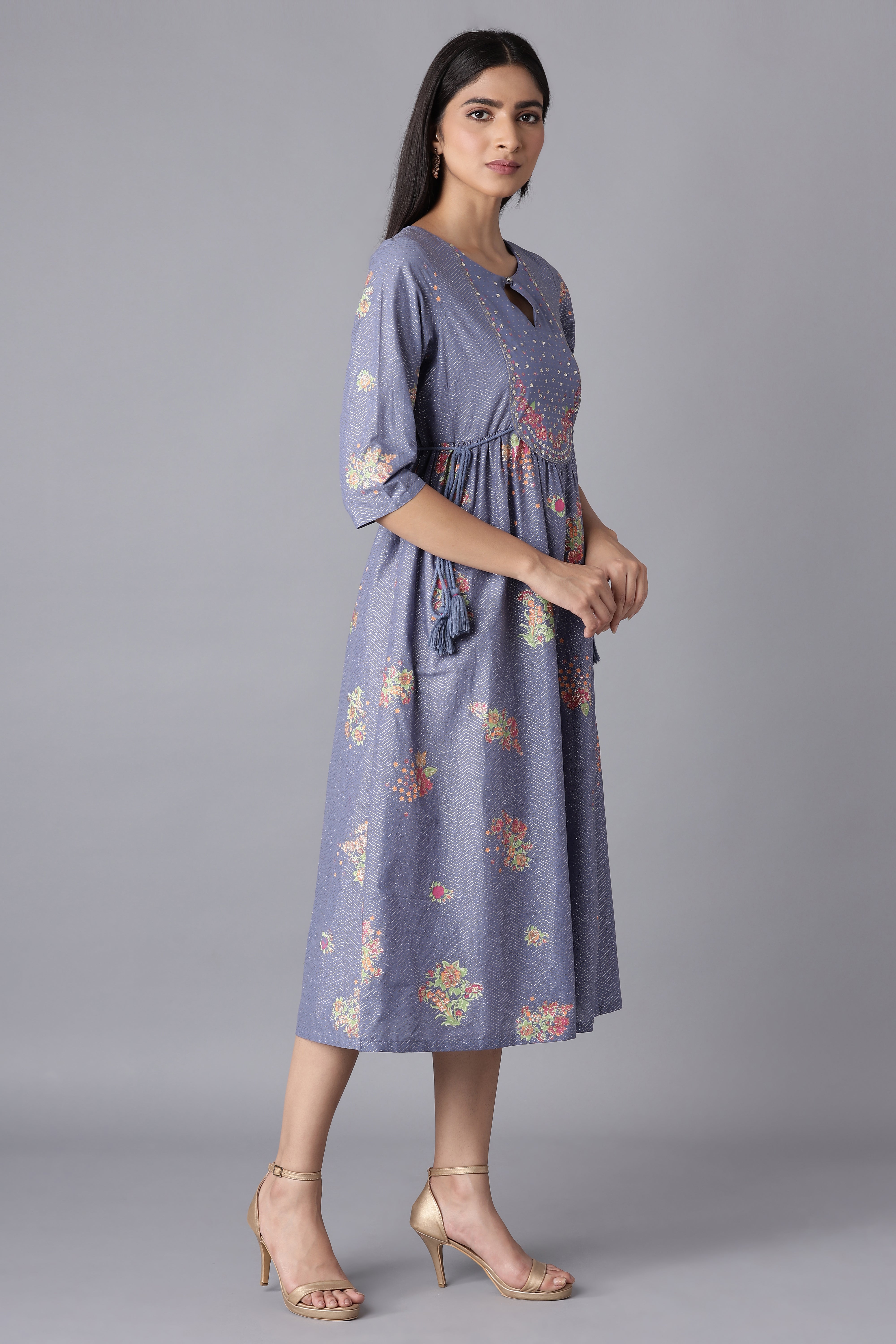 Cornflower blue gathered indo-western dress in floral print. It has round neck and three-quarter sleeves and tie-up detail.