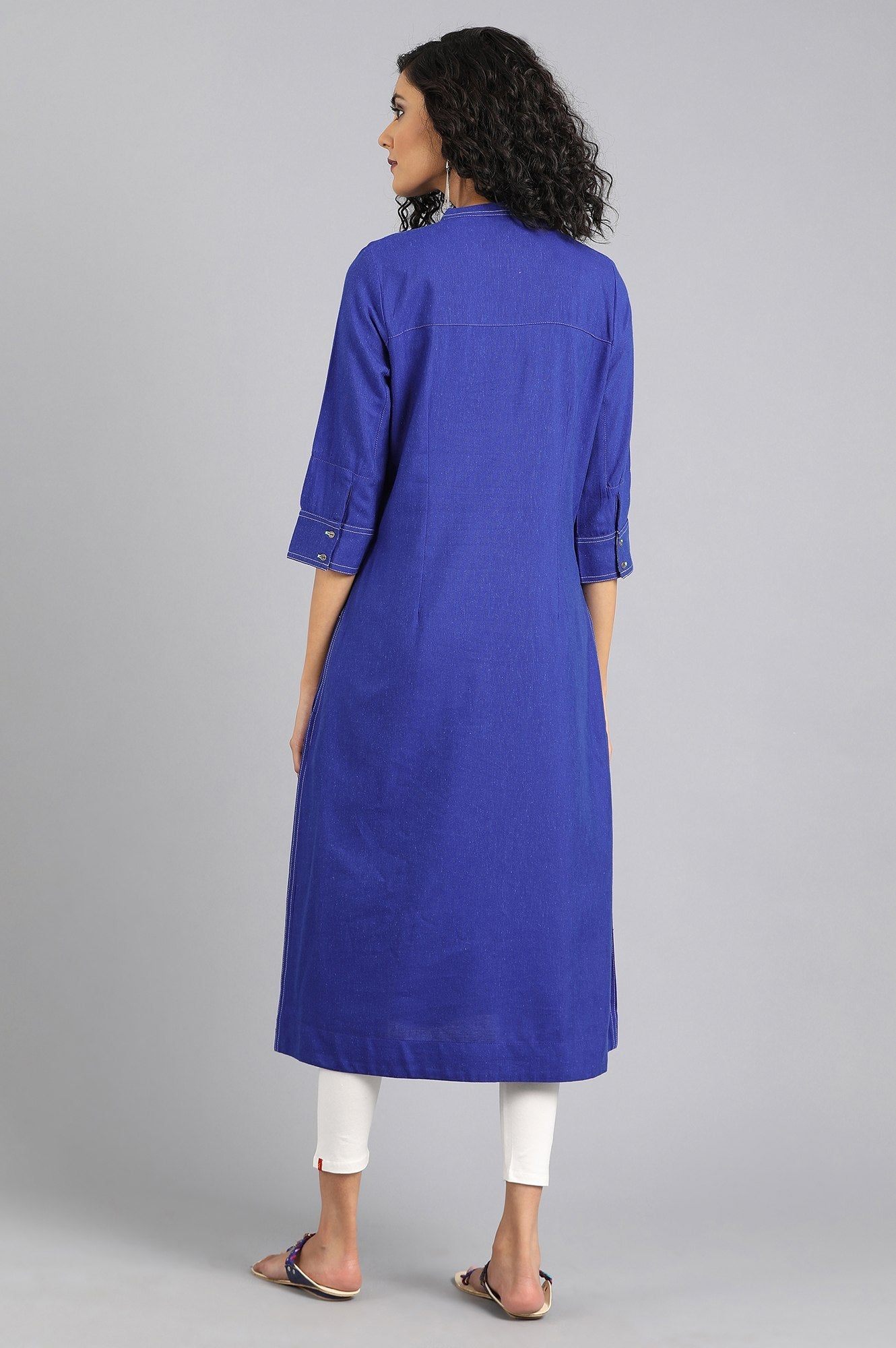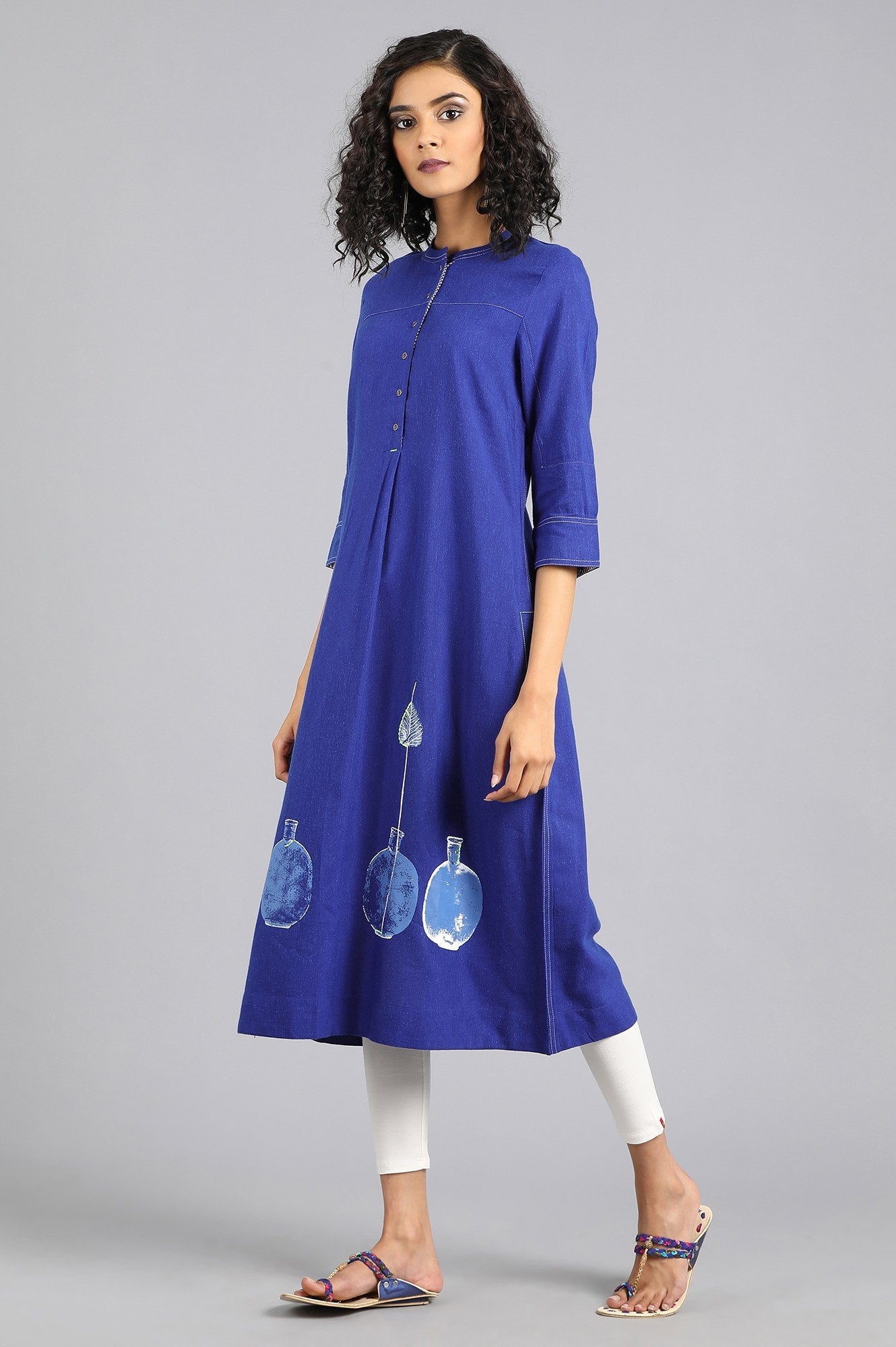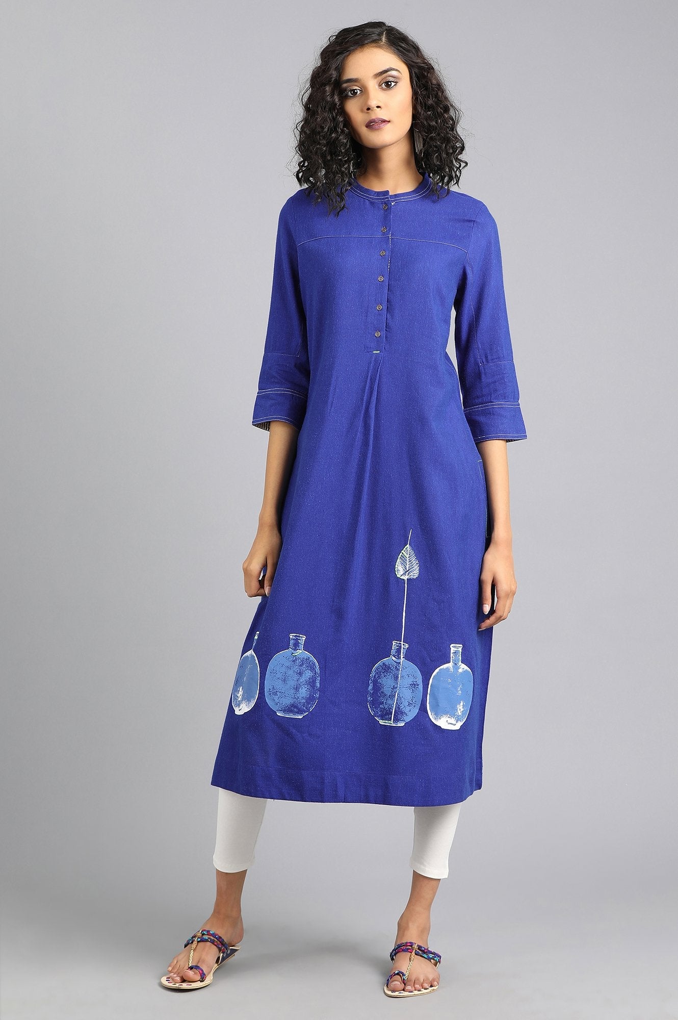 Blue mandarin neck 3/4 sleeve kurta with printed detail along with placket on the front.