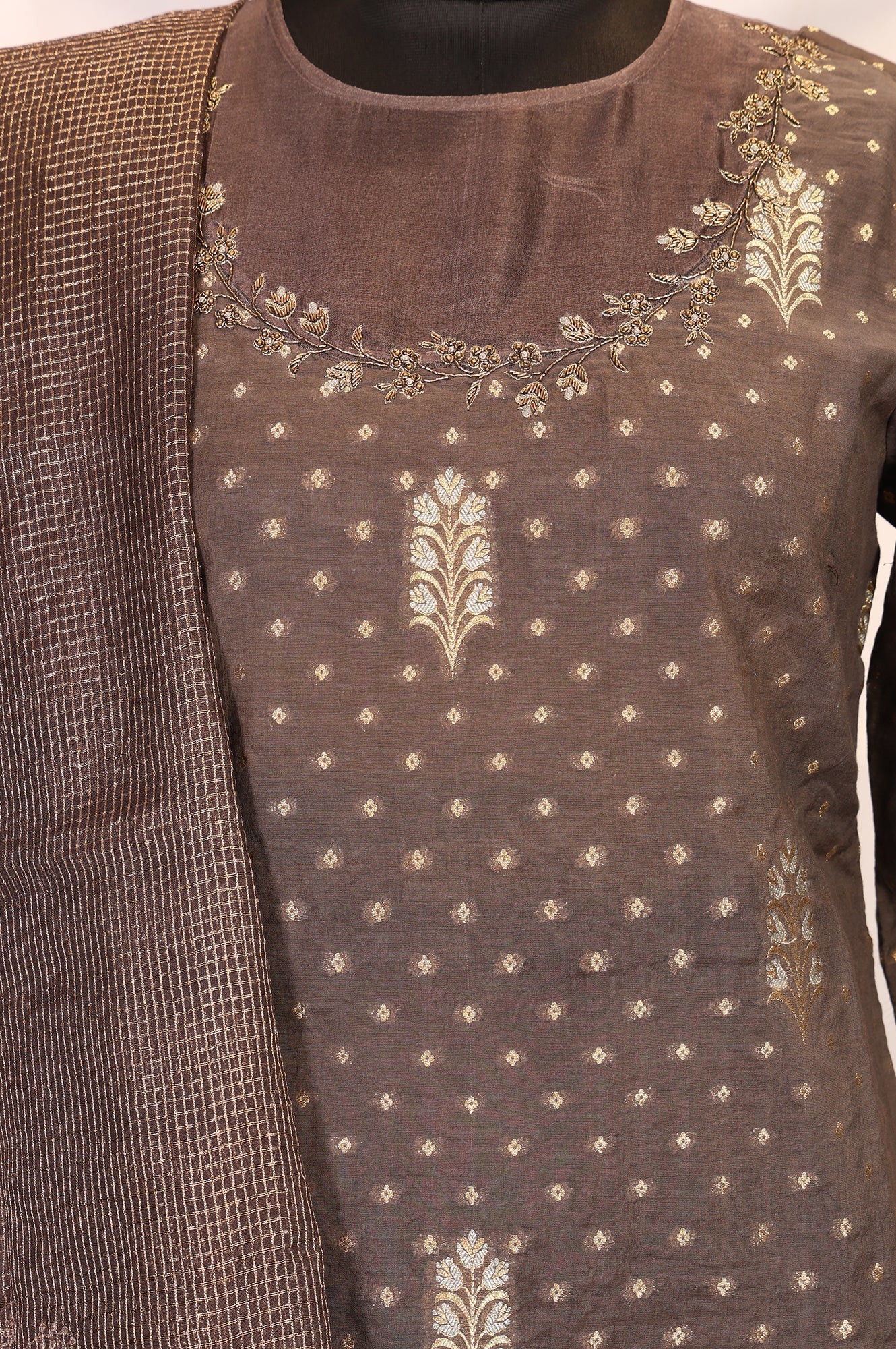 A sophisticated brown kurta set crafted from luxurious jacquard fabric, adorned with intricate embroidery and paired with matching straight pants. The zari-bordered dupatta adds a festive touch, making this ensemble perfect for traditional celebrations. Designed with a round neckline and three-quarter sleeves, this below-knee-length kurta offers a straight silhouette for effortless elegance. Ideal for festive gatherings, this set combines comfort and style seamlessly.