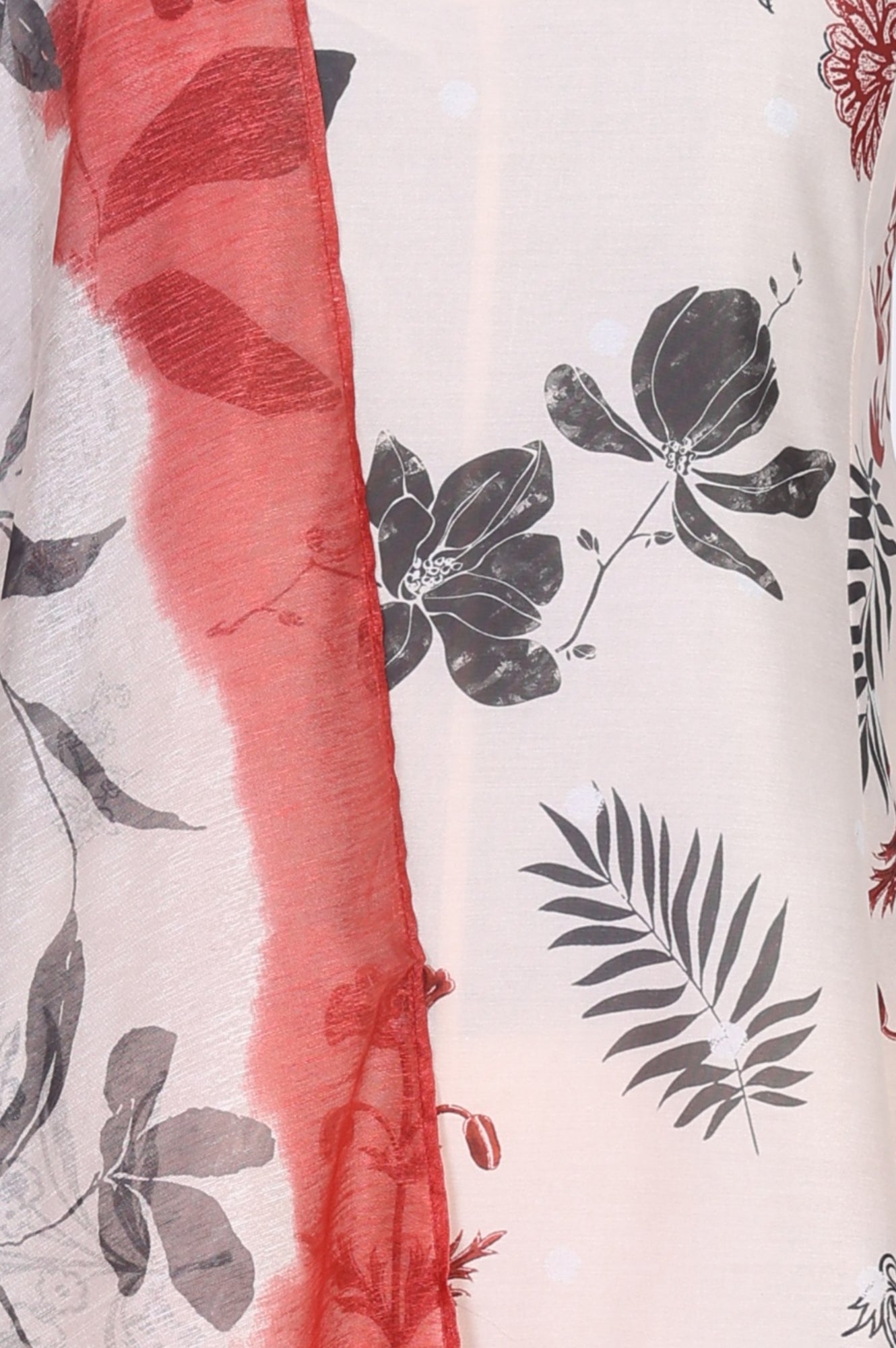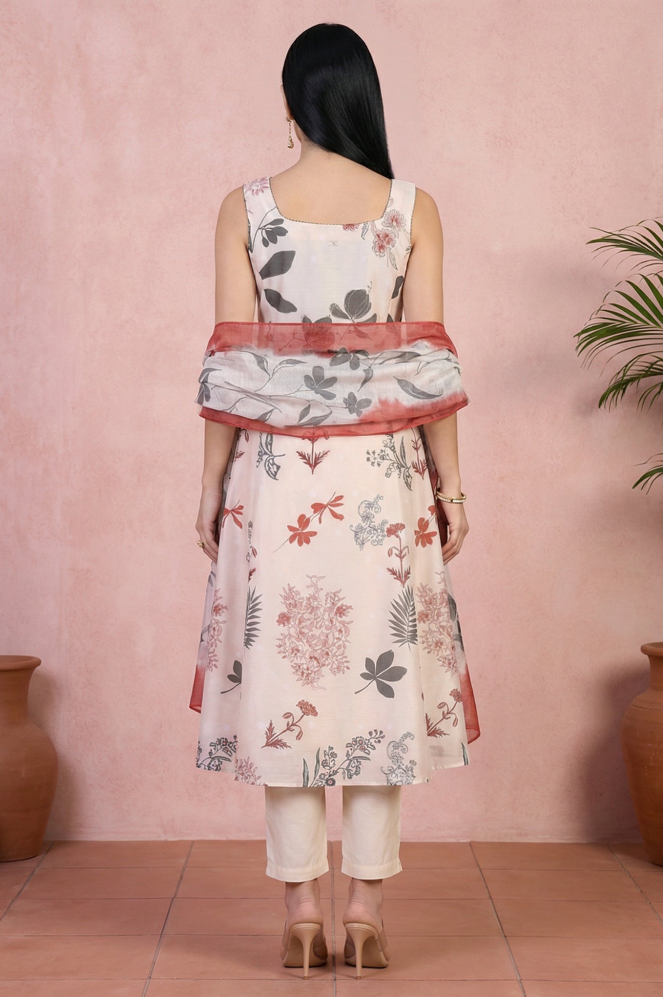 Cream Embroidered Floral Printed Chanderi A-line Kurta with Straight Pants and Dupatta Set
