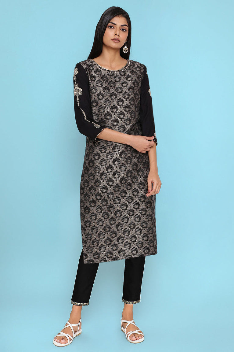 Black Metallic Embroidery Cotton Blend Straight Kurta and Slim Pant Set
