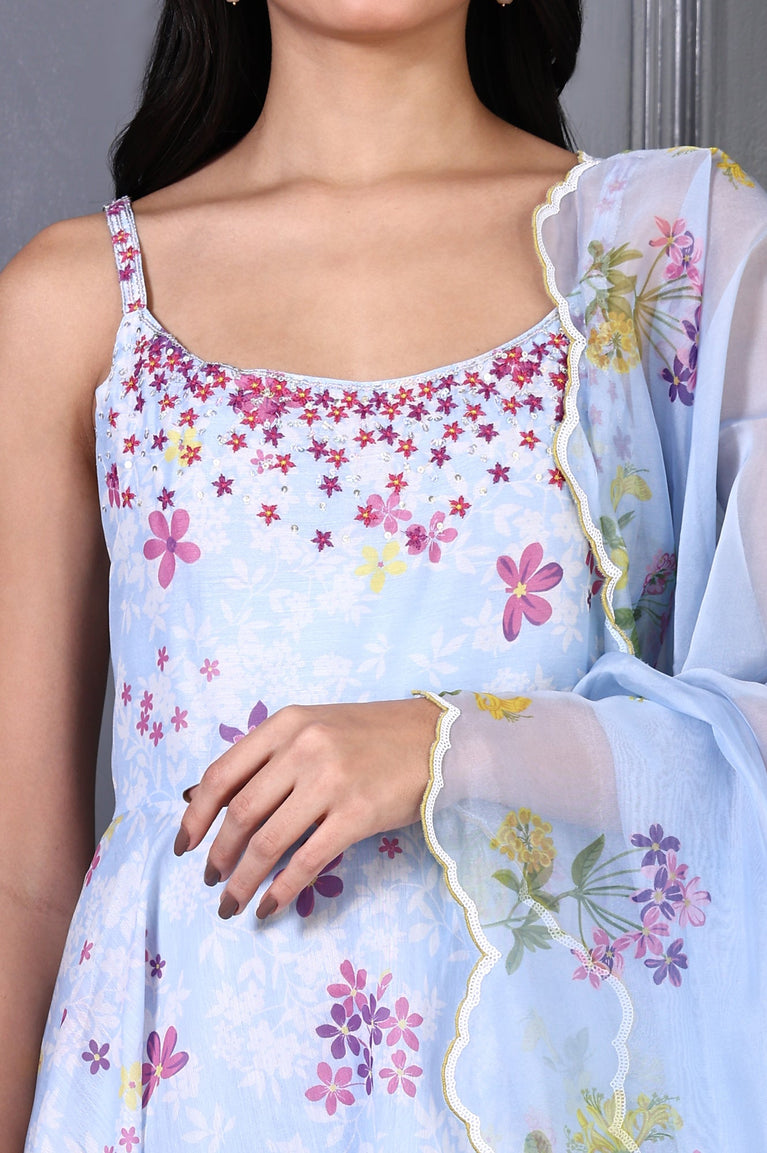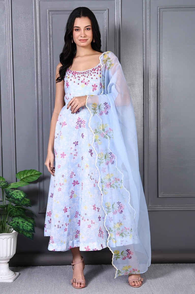 Blue Floral Printed Thread Work Chanderi Flared Dress and Dupatta Set