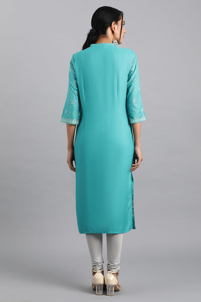 Elevate your ethnic wardrobe with this stunning women's kurta. Crafted from 100% rayon, this a-line kurta features an eye-catching geometric print that adds a modern twist to traditional design. The round neckline and three-quarter sleeves offer a perfect balance of style and comfort. Ideal for casual occasions, this woven blue kurta embodies the essence of ethnic fashion. Its versatile design makes it a must-have addition to any wardrobe, seamlessly blending contemporary aesthetics with timeless charm. Pair it with stylish sandals to complete the look, exuding effortless elegance. Versatile and timeless, this outfit is perfect for making a statement at any occasion, day or night.