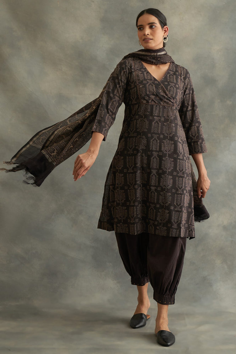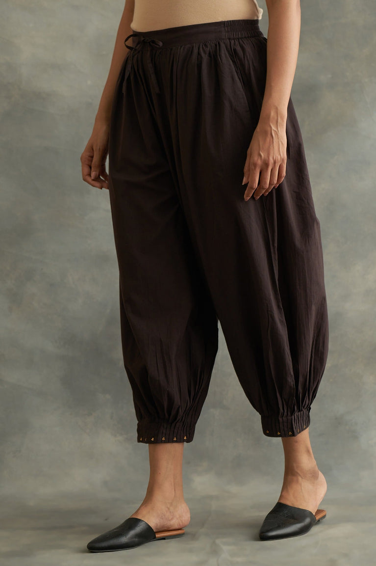 Softly tailored for effortless charm, these dark brown salwar pants are a versatile addition to your wardrobe. Designed with a pleated hem adorned with subtle sequin work, these trousers exude understated elegance. The elasticated waistband ensures a comfortable fit, while the side pockets add practicality. Crafted from 100% cotton, the woven fabric offers a breathable and lightweight feel, perfect for casual outings or festive gatherings. The tapered leg style and calf-length cut make these pants a stylish choice for pairing with block-printed kurtas or matching drapes. Elevate your ethnic fusion look with these relaxed-fit salwar pants.