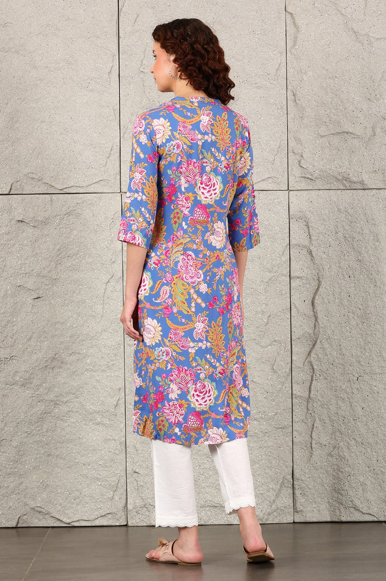 Blue Floral Printed Flared Rayon Kurta With Lace