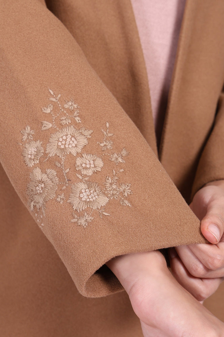 Step into the season with this elegant camel brown straight coat for women. Featuring an open front design and delicate embroidered sleeves, this coat is crafted from woven fabric for warmth and durability. Its straight silhouette and medium brown shade make it a versatile addition to your wardrobe, perfect for both casual outings and formal gatherings. Pair it with leggings or trousers for a chic and cozy look this winter.