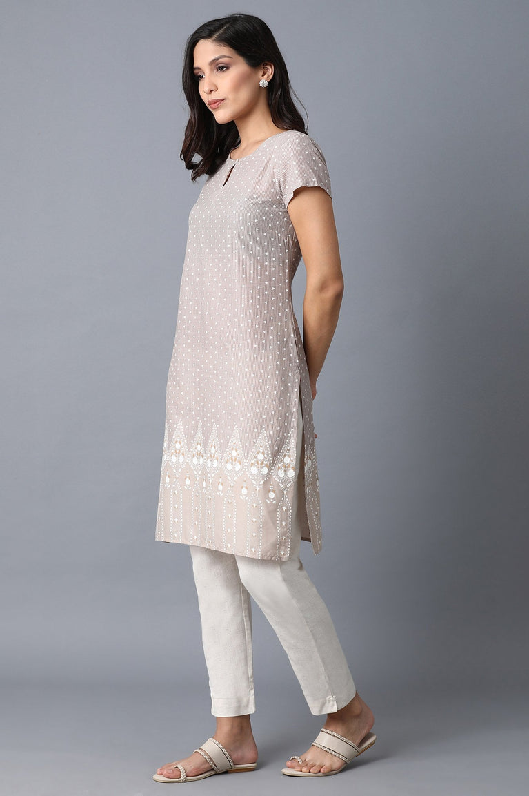 Keep it elegant and timeless with this beige printed straight Kurta Set, a refined ensemble that blends classic design with subtle sophistication. The kurta features a beautifully detailed embroidered neckline, adding delicate texture and charm to its clean, straight silhouette. Paired with coordinating striped pants for a touch of contemporary flair and a lightweight dupatta to complete the look, this set is perfect for both casual celebrations and semi-formal occasions. Crafted for comfort and versatility, this beige kurta set for women works effortlessly for festive gatherings, office wear, or day events. A graceful addition to your ethnic wardrobe, combining ease, elegance, and understated style.