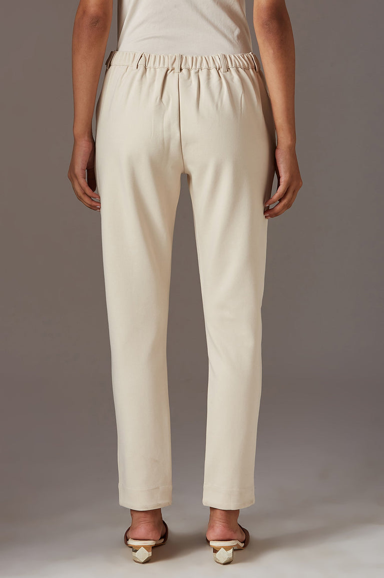 Experience the effortless charm of these beige trousers, designed for a chic and comfy look. The mid-rise waist and partially elasticated waistband ensure a perfect fit, while the ankle length adds a modern touch. Crafted from 100% cotton, these solid trousers feature two front pockets, making them both stylish and practical. Pair them with a kurta and flats for a casual yet sophisticated ensemble.