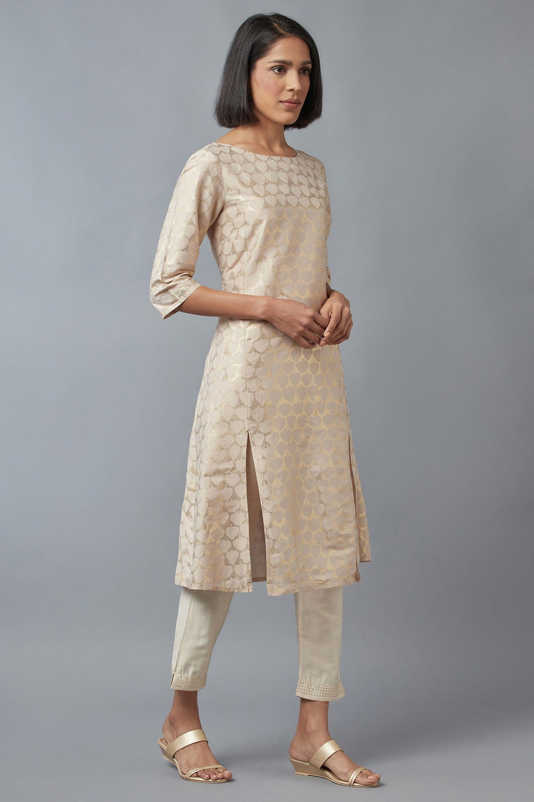 Elevate your ethnic wardrobe with this exquisite beige kurta, perfect for special occasions. Crafted from a luxurious blend of 85% viscose and 15% manmade fiber, this woven masterpiece offers both comfort and style. The three-quarter sleeves and round neckline add a touch of elegance, while the A-line silhouette flatters various body types. The kurta features a captivating printed design that adds a contemporary twist to traditional attire. The viscose blend fabric ensures breathability and a soft feel against the skin, making it ideal for extended wear during festivities or formal events. This versatile piece can be paired with matching bottoms and accessories to create a stunning ensemble that's sure to turn heads.