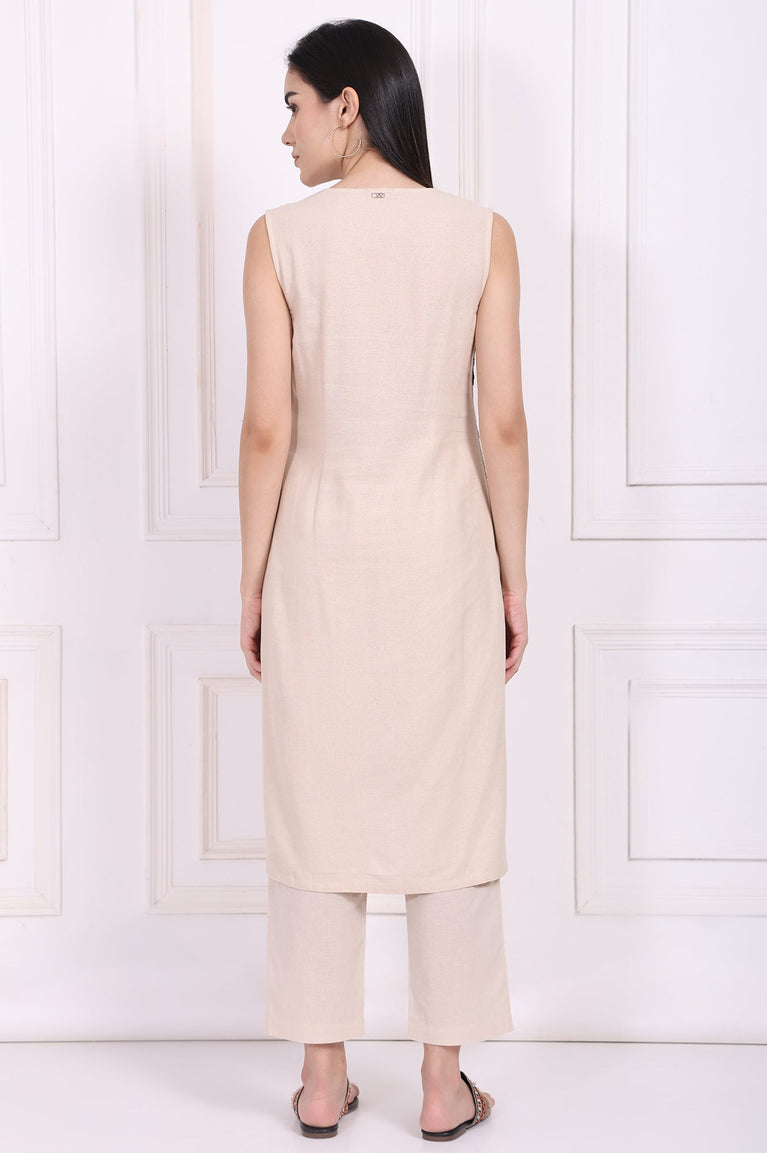 A portrait of modern grace, this Natural Ecru kurta set for women is a study in sophisticated contrasts. The sleeveless A-line kurta glides over the frame, offering a silhouette that’s both flattering and supremely comfortable for all-day wear. Its entire front panel is a canvas for intricate floral embroidery, rendered in a bold black thread that stands out against the serene base, creating a stunning visual texture that feels luxurious to the touch. This beautiful ethnic co-ord set is perfect for those who appreciate detailed craftsmanship. The kurta features an elegant V-neckline, which is delicately finished with a fine lace trim for an added touch of femininity and charm. High side slits on the straight hemline ensure graceful movement, while the solid back provides a moment of chic simplicity. Designed for effortless style, this kurti set is a masterpiece of contemporary ethnic wear. The ensemble includes a pair of minimalist straight pants, crafted from the same comfortable fabric for a cohesive look. These pants come with an elasticated waistband ensuring a perfect, flexible fit and feature a handy side pocket for your essentials. This embroidered kurta pant set is ideal for brunches, festive gatherings, or any day you choose to celebrate your personal style. It’s a timeless two-piece ensemble you'll treasure.