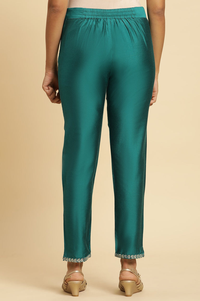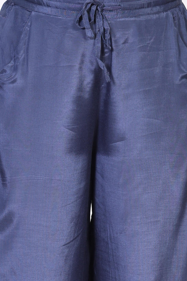 Softly tailored for elegance, these women's blue parallel pants are crafted from luxurious shantung fabric. The mid-rise waistband features a drawstring closure for a comfortable fit, while the wide-leg silhouette ensures effortless movement. Embellished with intricate embroidery along the hem, these trousers exude festive charm. Slant pockets add practicality, making them perfect for both casual outings and elevated occasions. Pair them with a chic top and heels for a polished look.