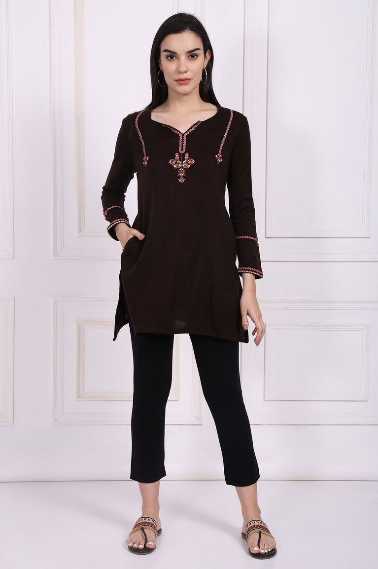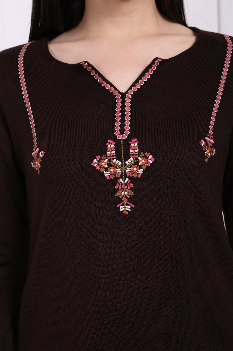 Warmth meets artistry in this beautifully crafted tunic for women, a sublime choice for navigating the cooler seasons with grace. Rendered in a deep, earthy tone that evokes a sense of grounded elegance, this apparel is a testament to contemporary ethnic design. The silhouette is thoughtfully constructed, featuring a flattering notched V-neckline that draws the eye to the stunning, multi-hued thread embroidery gracing the yoke. This intricate ornamentation, a delicate dance of floral-inspired motifs, is tastefully mirrored at the cuffs of the cozy full-length sleeves, creating a harmonious and polished look. As an essential piece of ethnic wear for women, it's designed in a timeless straight cut that drapes beautifully over the frame. This classic shape ensures comfort and unrestricted movement, which is thoughtfully enhanced by the inclusion of side slits at the straight hemline. The fabric is completely opaque, offering modest coverage and a confident feel throughout the day. Hidden within the seams are discreet pockets, a practical touch that adds to the tunic's everyday appeal. This brown embroidered winter tunic is more than just a garment; it's a versatile statement of style, perfect for casual outings, office wear, or intimate festive gatherings. You'll find yourself reaching for this elegant straight acrylic kurti again and again.