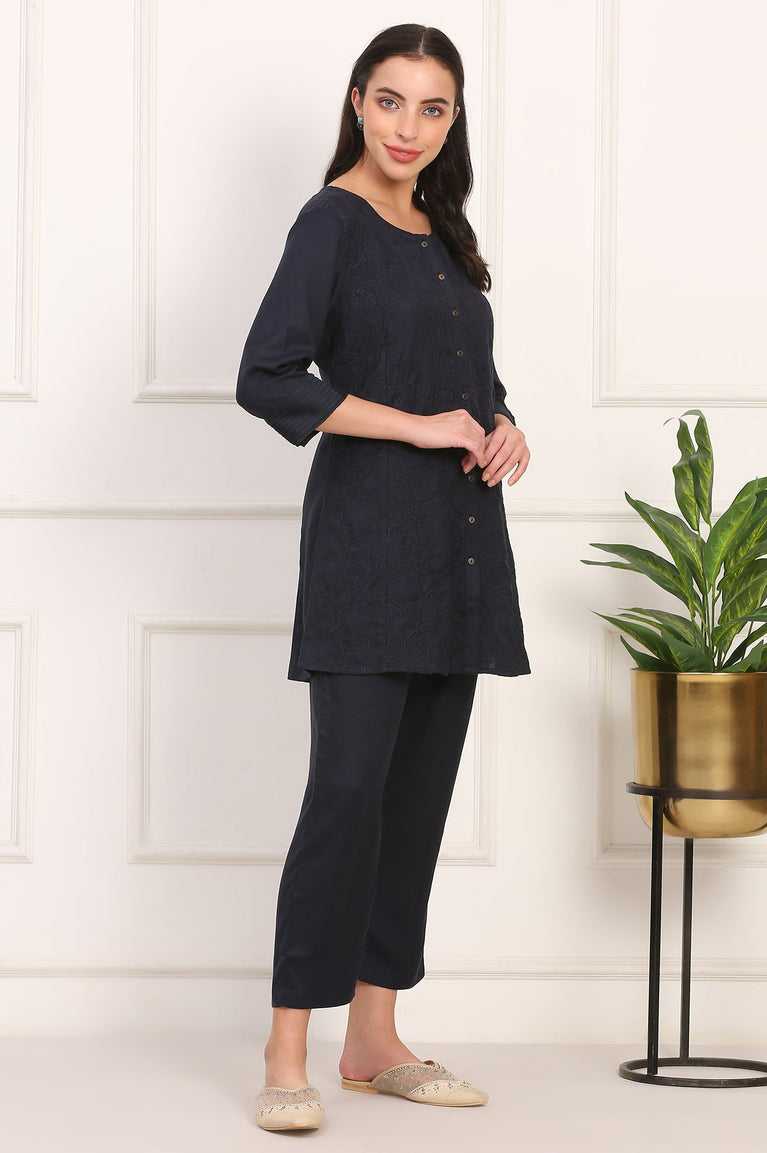 Blue Solid Embroidered Rayon Flax A-line Tunic and Straight Pants Co-ord Set