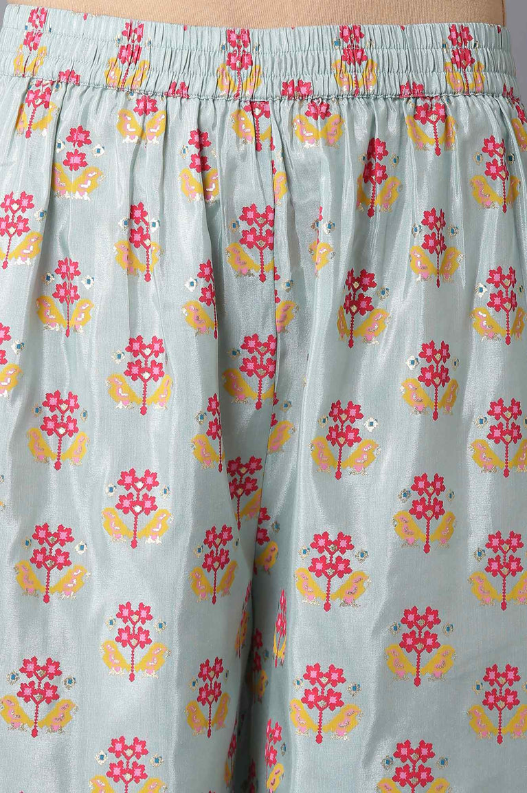 Style This Pretty Blue Front Open kurta And Slim Pants Set At Your Light Festive Event. This Brittany Blue kurta Is Adorned With Glitter Print And Has Bead Work. It Also Features Front Slit And Has Round Neck. Coordinated With Blue Floral Parallel Pants In Mid-Rise And Partially Elasticated Waistband.