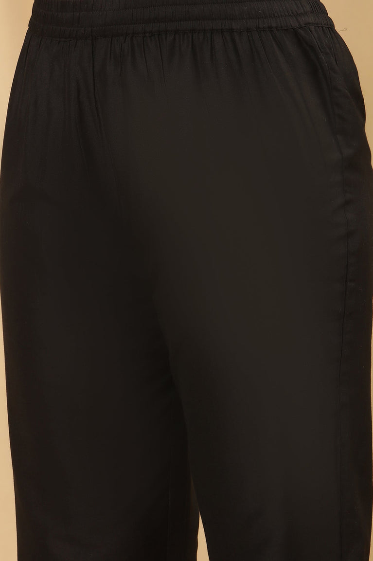 Embrace ethnic elegance with this stunning women's ensemble featuring a kurta, straight pant, and dupatta set. The black kurta, adorned with a beautiful floral print, exudes sophistication and charm. Crafted from 100% viscose, this woven outfit offers a comfortable and flowy feel, perfect for casual outings or festive gatherings. The three-quarter sleeves provide a balance between style and comfort, while the v-neck adds a touch of allure. The flared silhouette of the kurta creates a graceful movement, complementing various body types. This ethnic set seamlessly combines traditional design elements with modern sensibilities, making it a versatile addition to any wardrobe. Whether worn for a family gathering or a casual day out, this ensemble promises to make a lasting impression with its timeless appeal and comfort.