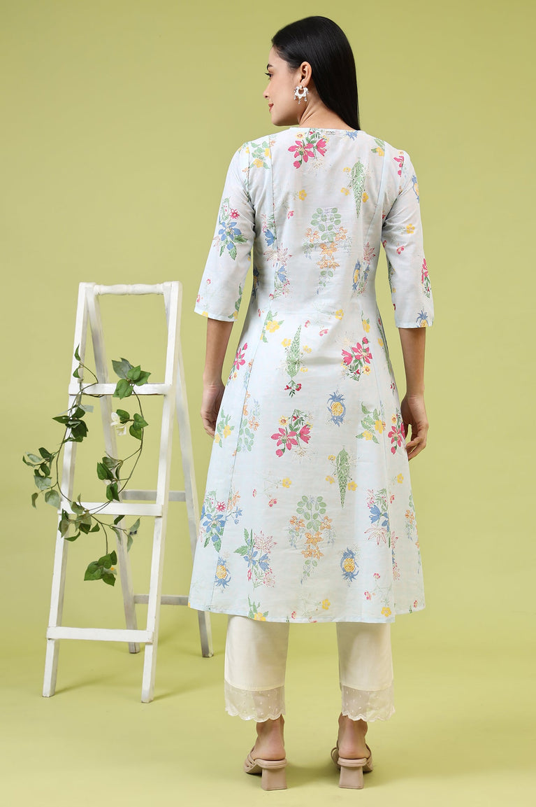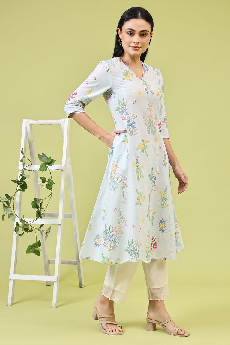 Blue Floral Printed Pure Cotton A-line Kurta with Thread Embroidery