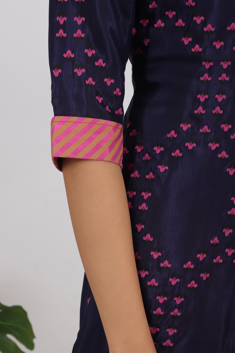 Indigo Blue Printed Kurta With A Neck Slit At Front. Front Yoke Has Been Highlighted With Fine Surface Ornamentation And Neck Has Been Finished With A Tassel And An Embroidered Button.