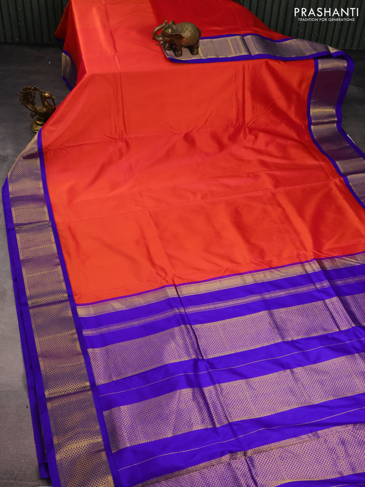 10 Yards silk saree dual shade of pinkish orange and blue with plain body and zari woven border
