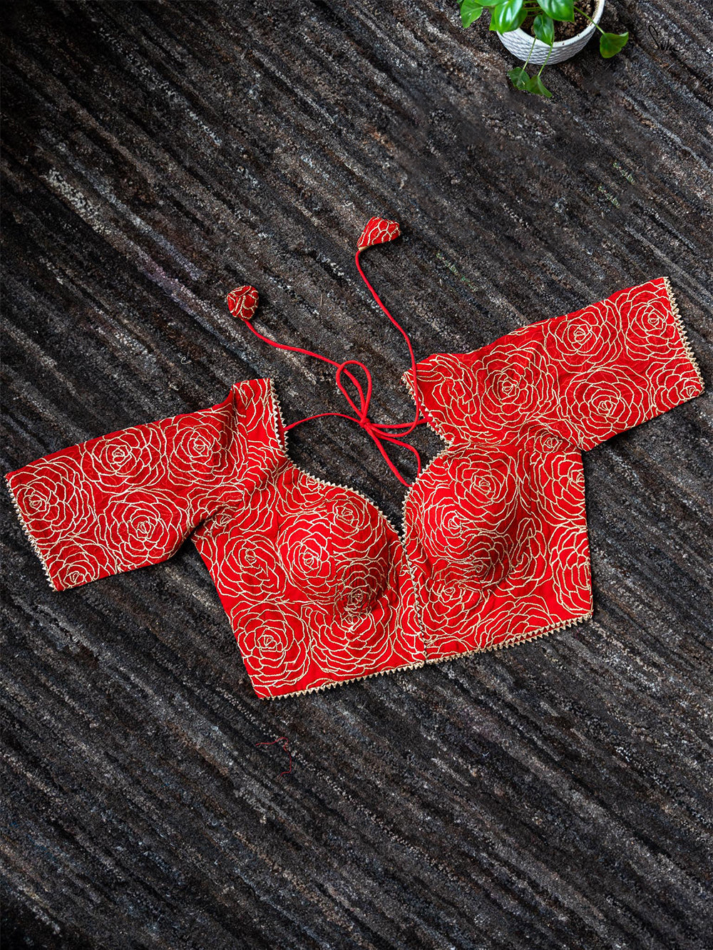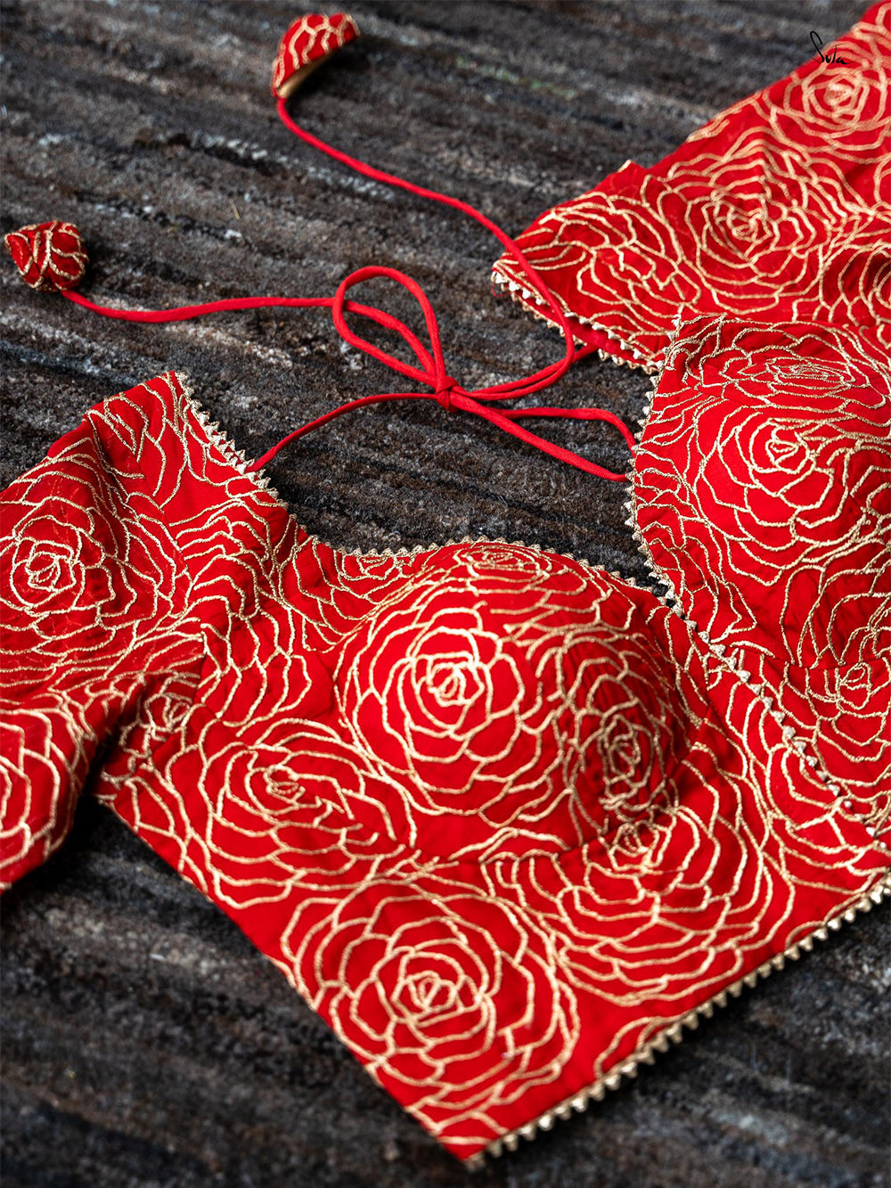 This red blouse, crafted from luxurious viscose organza, feels like a hug, offering comfort that allows you to move with ease. Delicate gold zari-embroidered roses seamlessly compliment your saree.