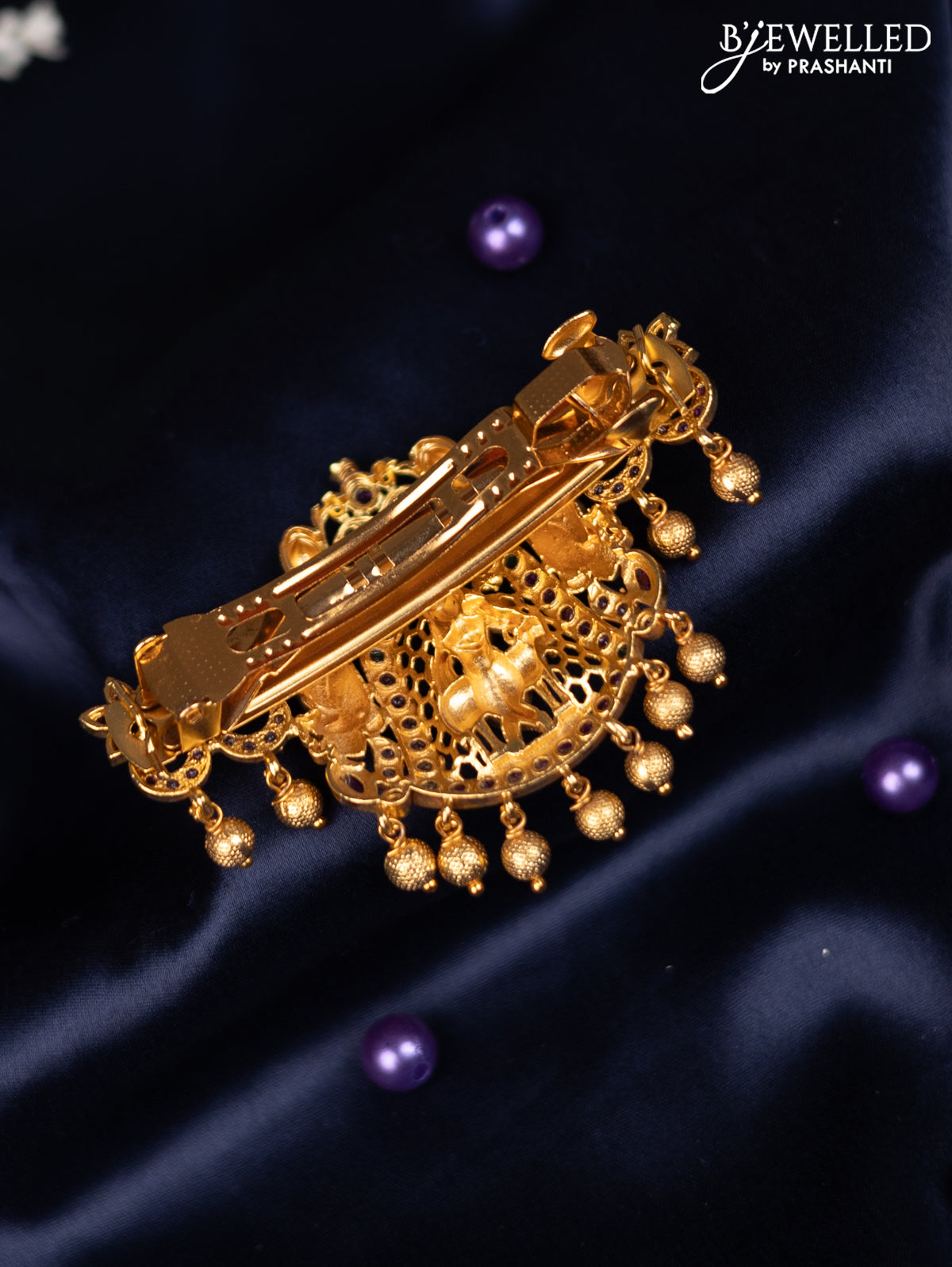 Antique hair clip big size krishna design with kemp stones and golden beads hanging