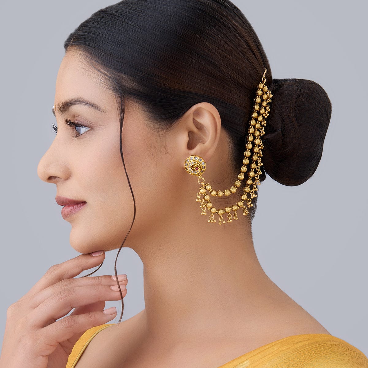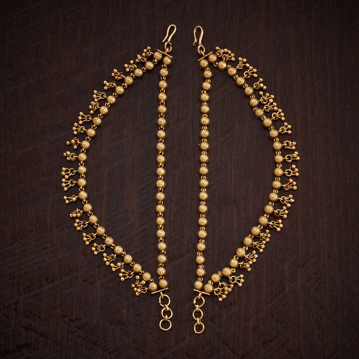 Elevate your traditional look with this pair of antique Matil this festive season. Its elegant design and impressive finishing will add an alluring charm to your Indian look and will make you stand out among the crowd. You can style it with both tied or loose hair. Its gold polishing will enhance your traditional look, complementing the all-ethnic vibes. Style up your attire with our antique matil this festive season.