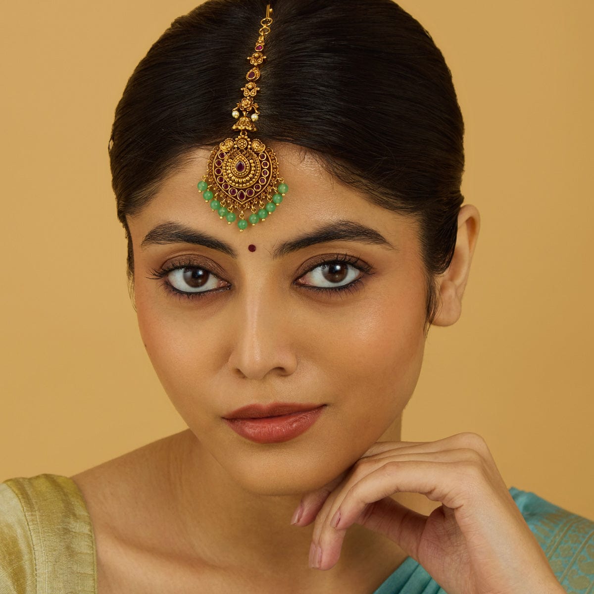 Crafted from copper alloy, this antique tikka features intricate detailing with stunning ruby-green stones in gold hues. The gold polished finish highlights its timeless appeal, while the hook closure ensures a snug fit. Complete your bridal look by pairing it with a traditional lehenga or saree for a royal touch.