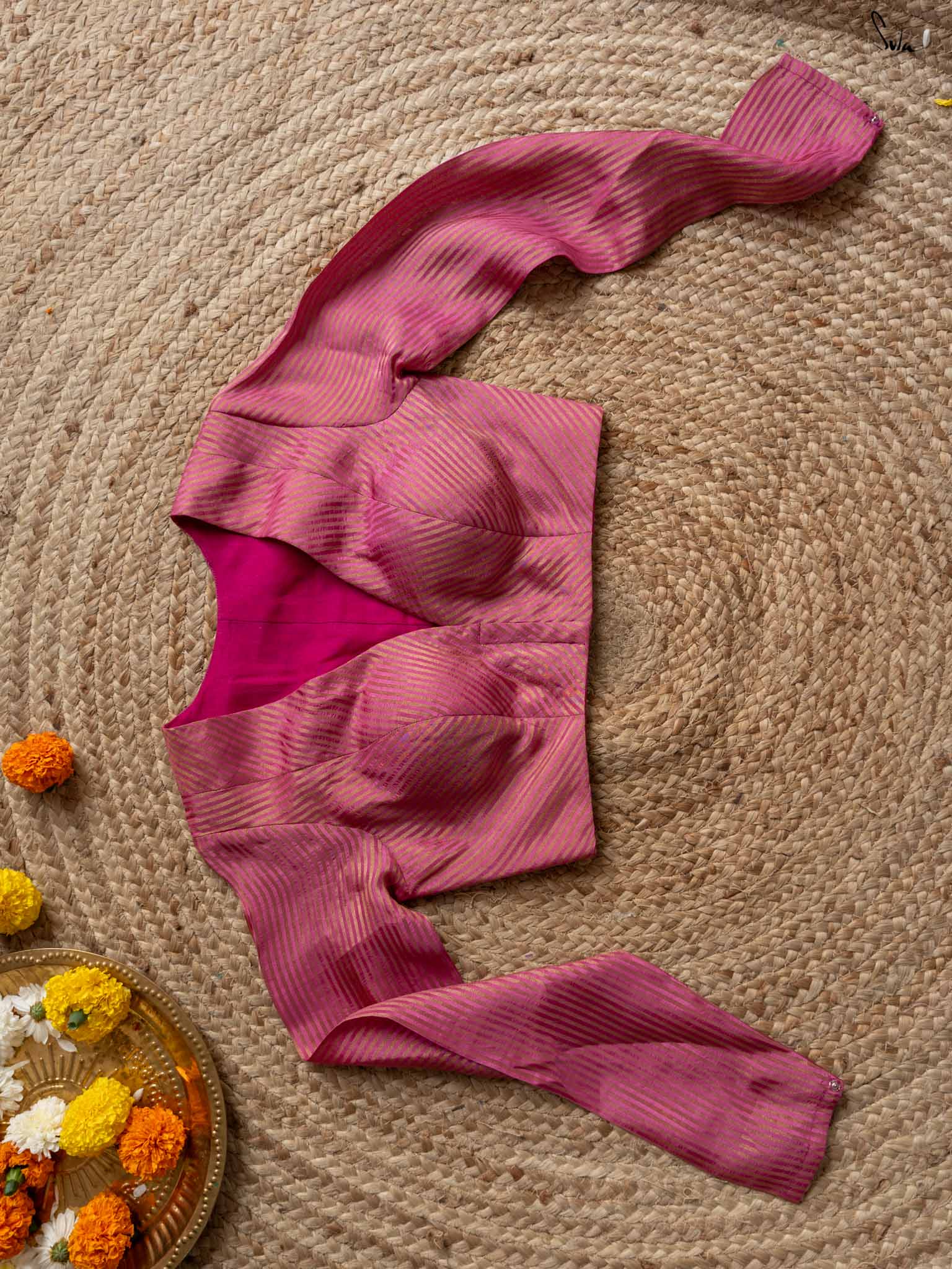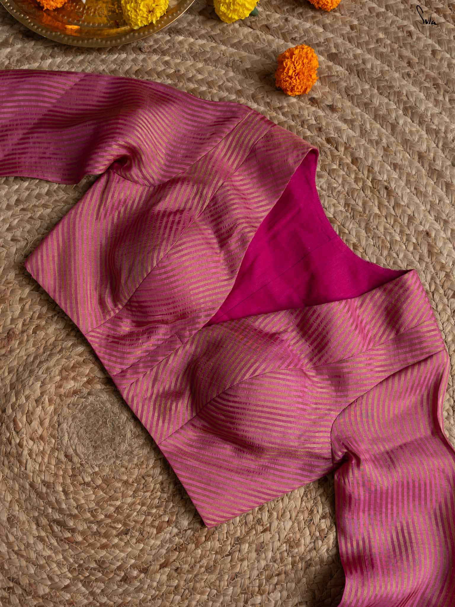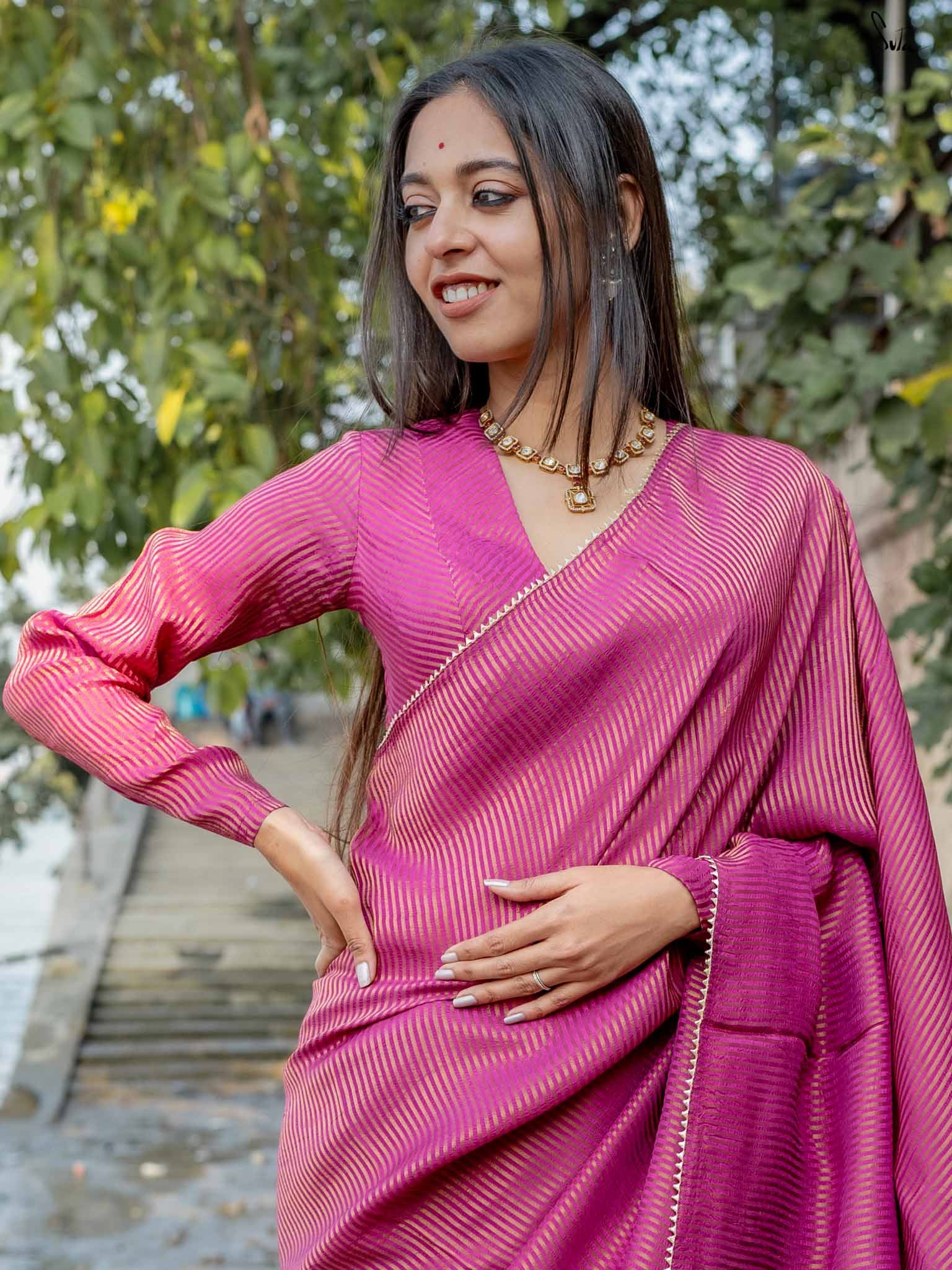 A rich burgundy blouse with V-neckline and woven zari stripes. crafted from breathable viscose zari, it features full sleeves and a front hook opening, perfect for any event.