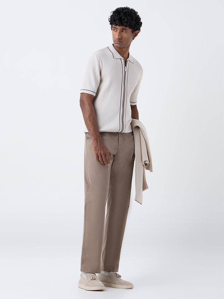 Ascot introduces this beige t-shirt, tailored from a luxurious-blend fabric with a self-striped texture. Framed in a relaxed shape, it features a spread collar, zipper front and short sleeves. The design blends polish with an easy-going attitude for everyday refinement.