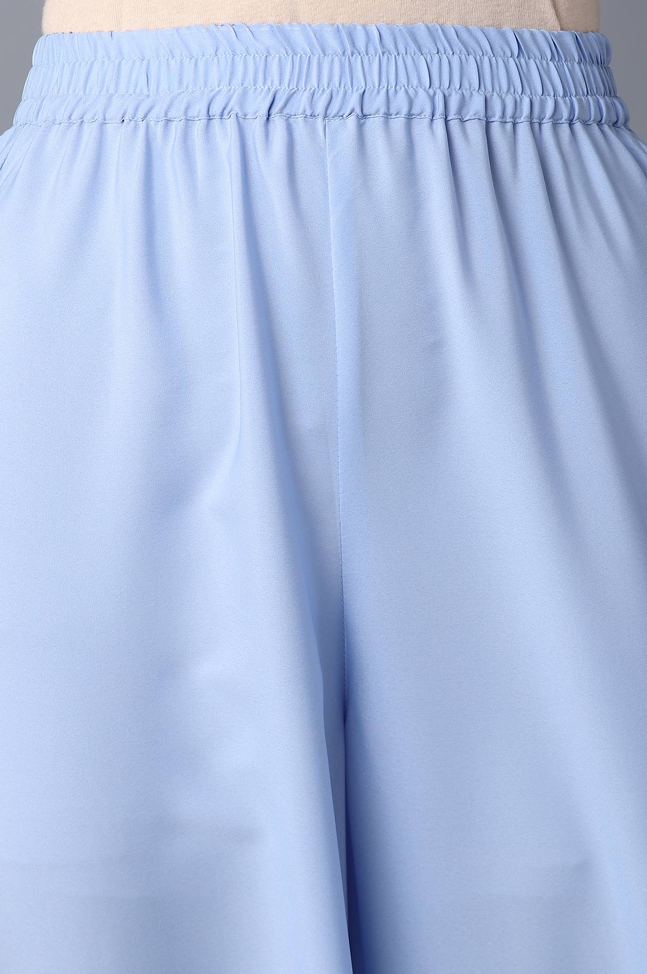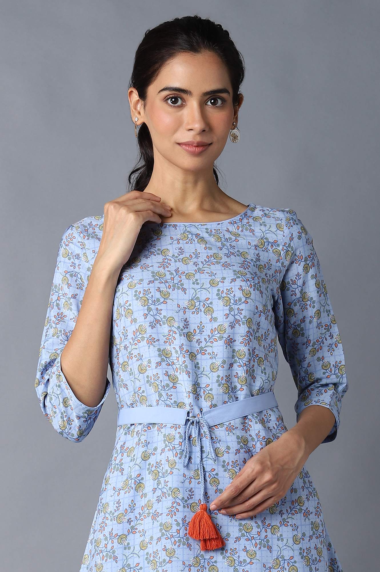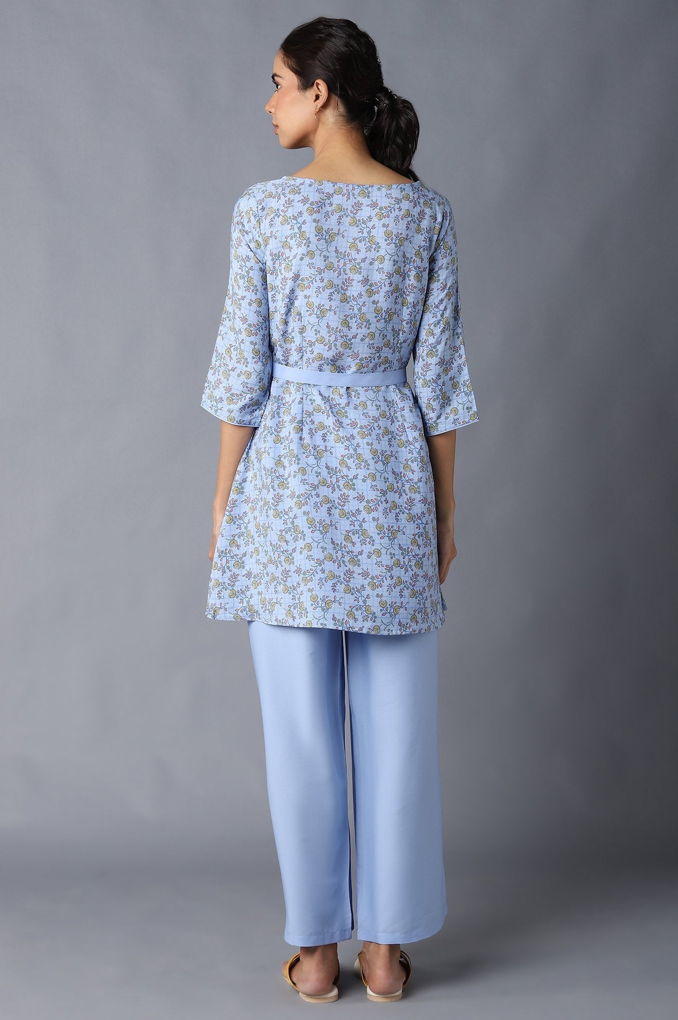 Blue Floral Print A-Line kurta With Belt And Having Boat Neckline. It Is Coordinated With Palazzo Pants In High-Rise.