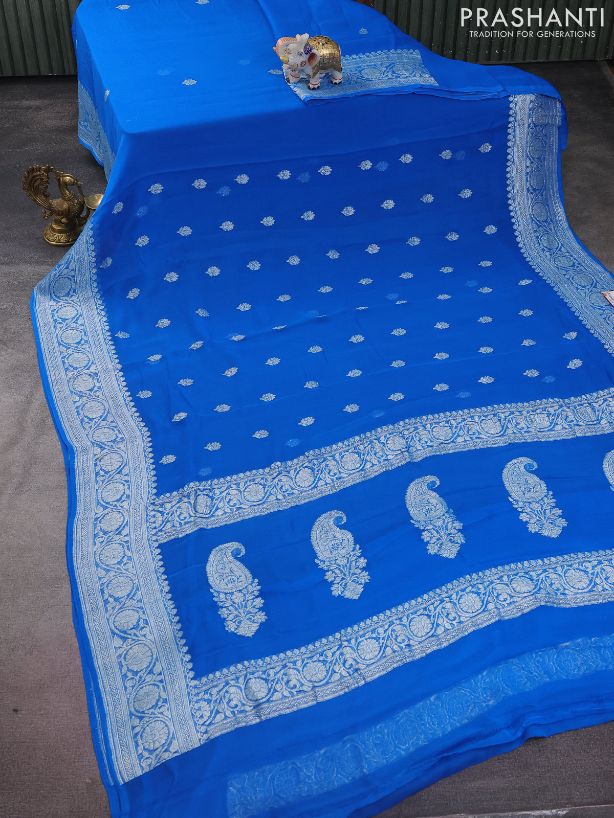 Banarasi chiffon silk saree cs blue with silver zari woven buttas and silver zari woven border