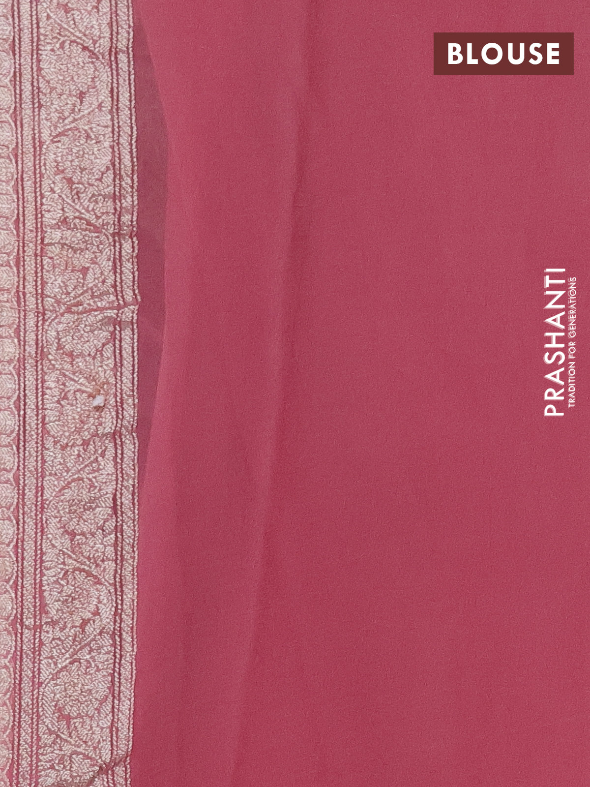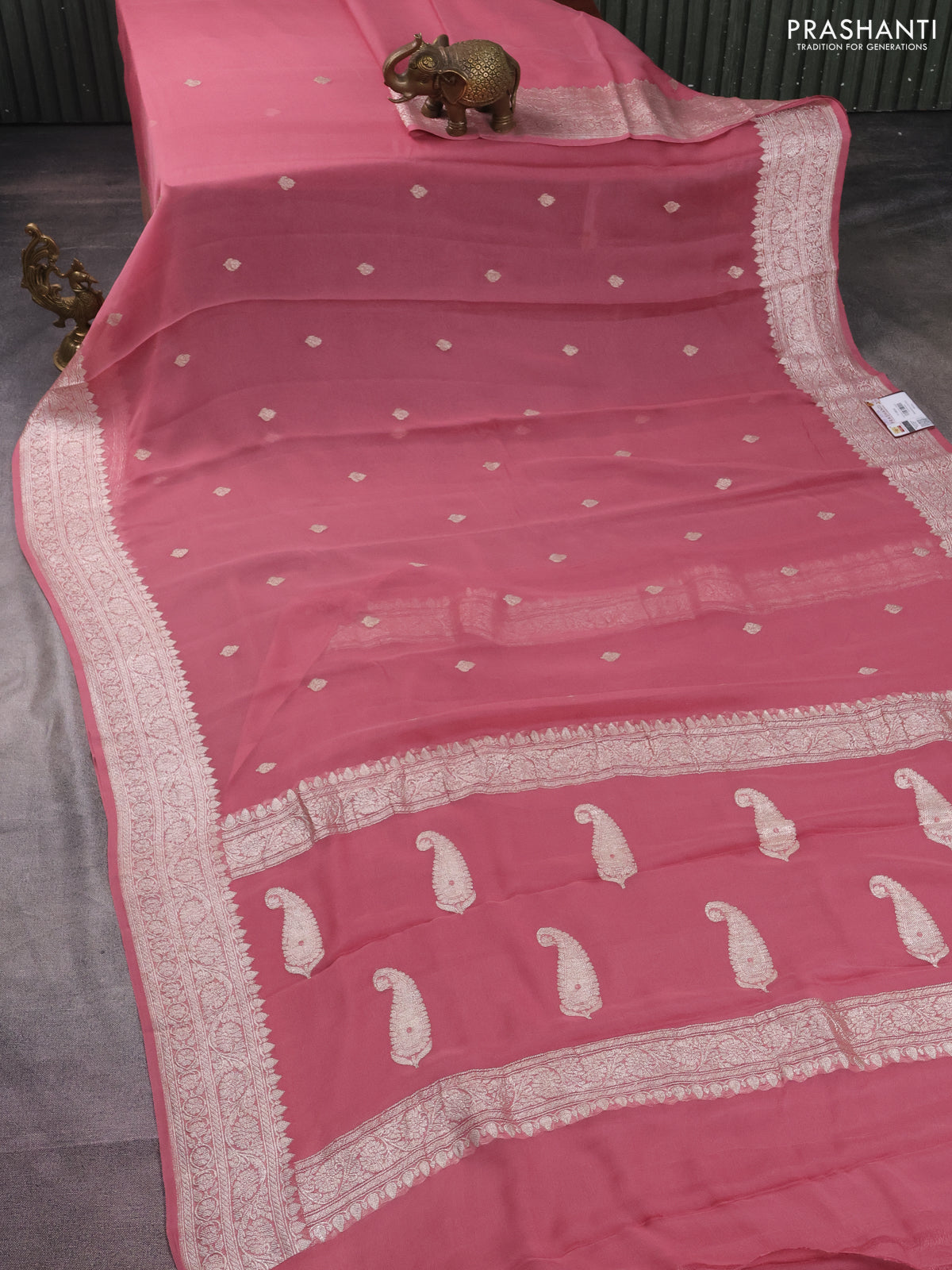 Banarasi chiffon silk saree peach shade with silver zari woven buttas and silver zari woven border