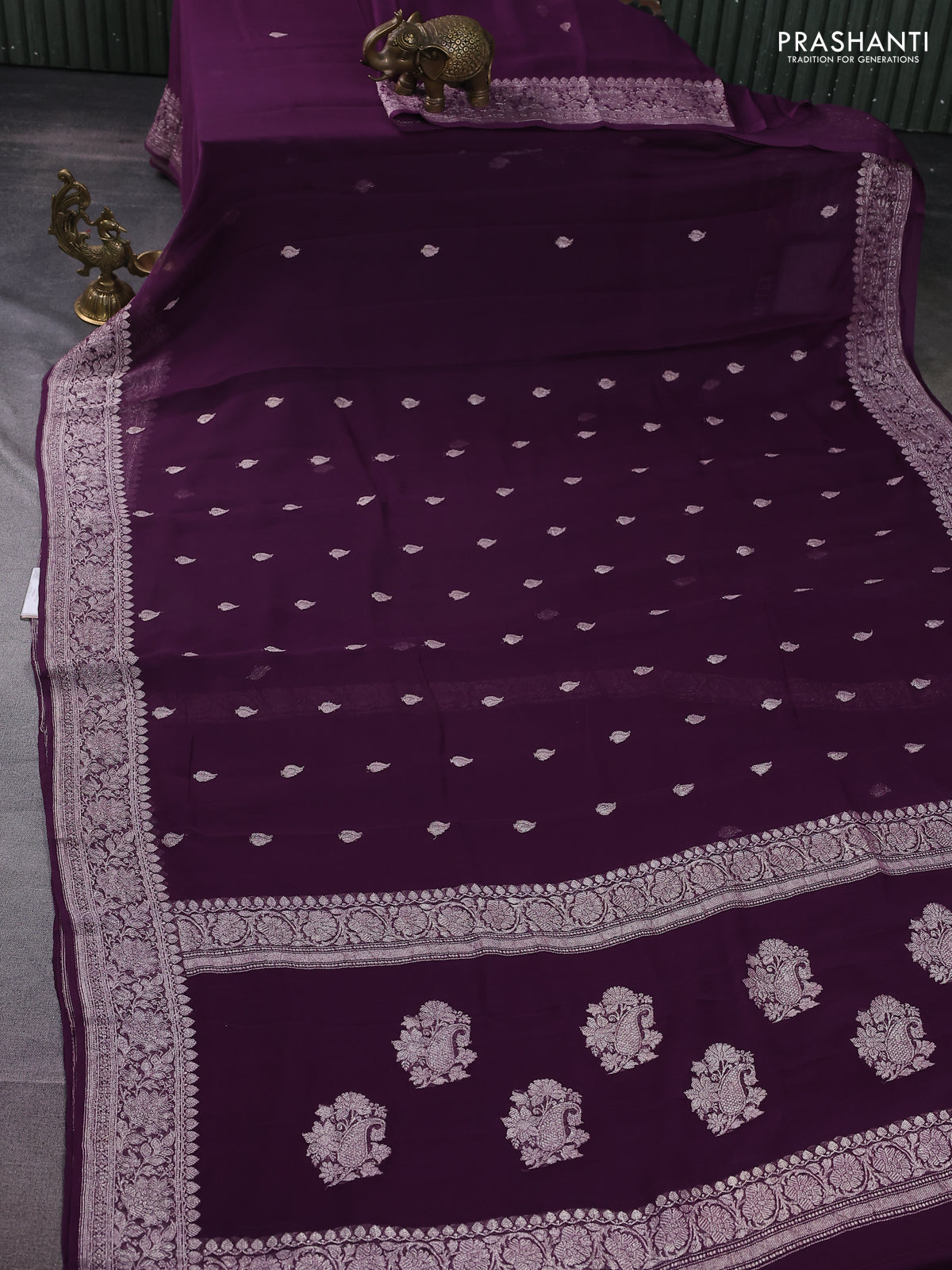 Banarasi chiffon silk saree wine shade with silver zari woven buttas and floral silver zari woven border