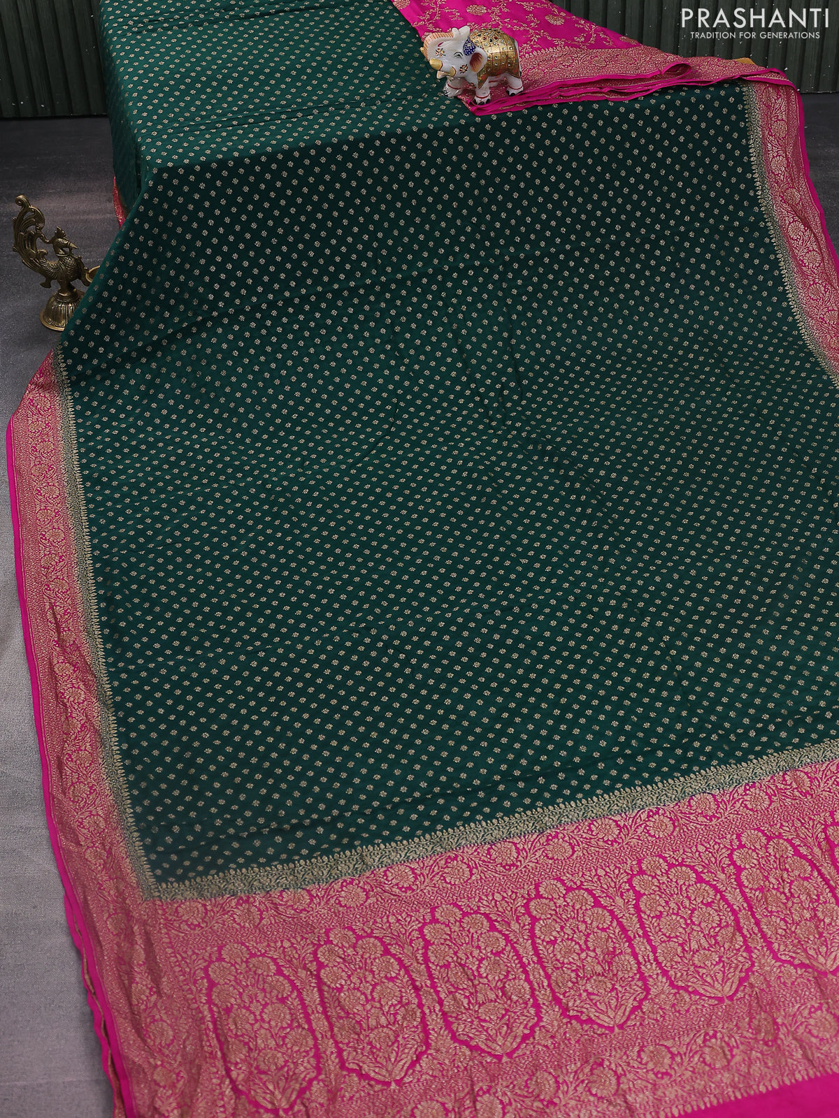 Banarasi crepe partly saree green and pink with woven buttas and woven border