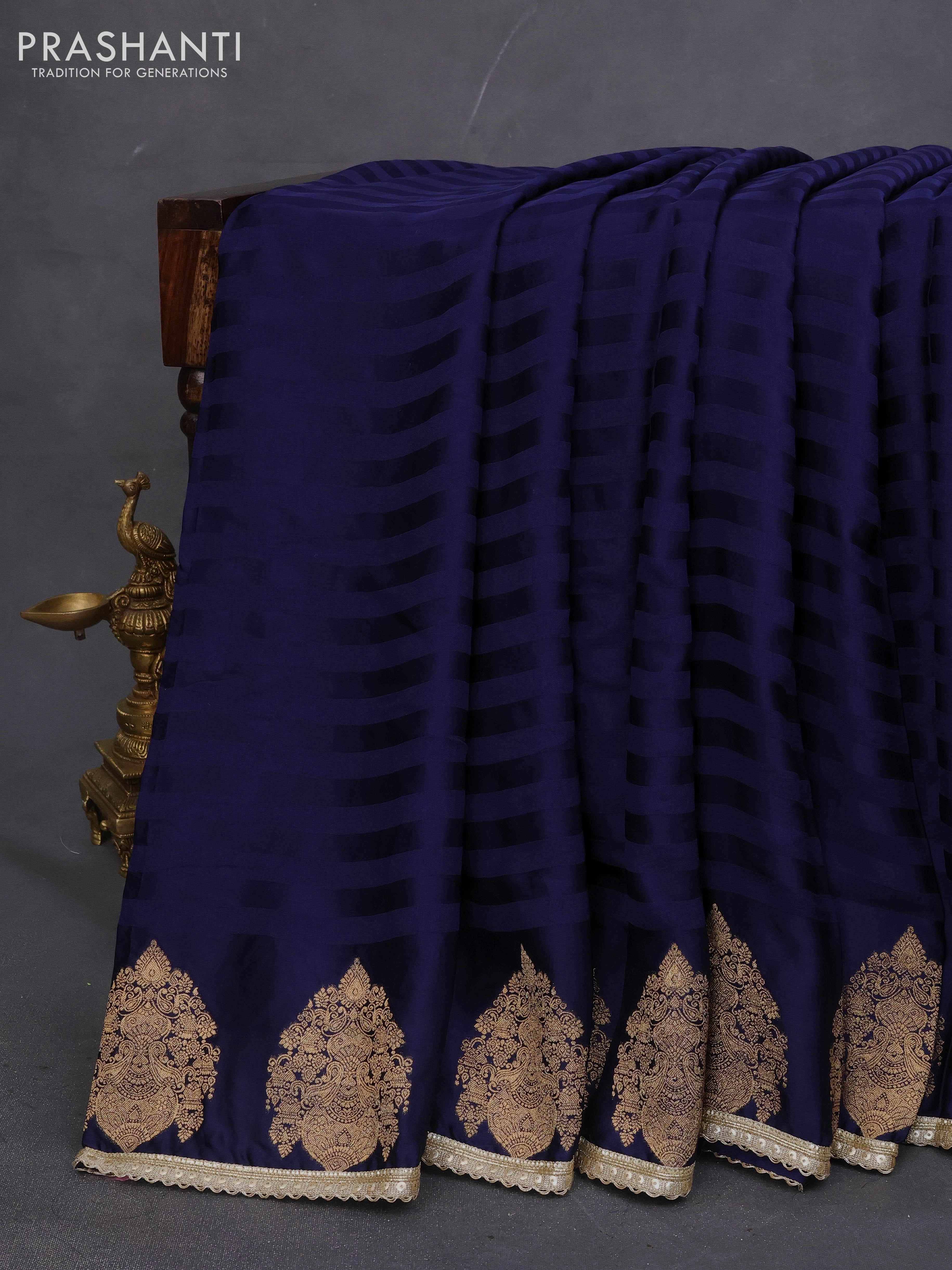 Banarasi crepe saree dark blue with stripes pattern and mirror work & banarasi style border